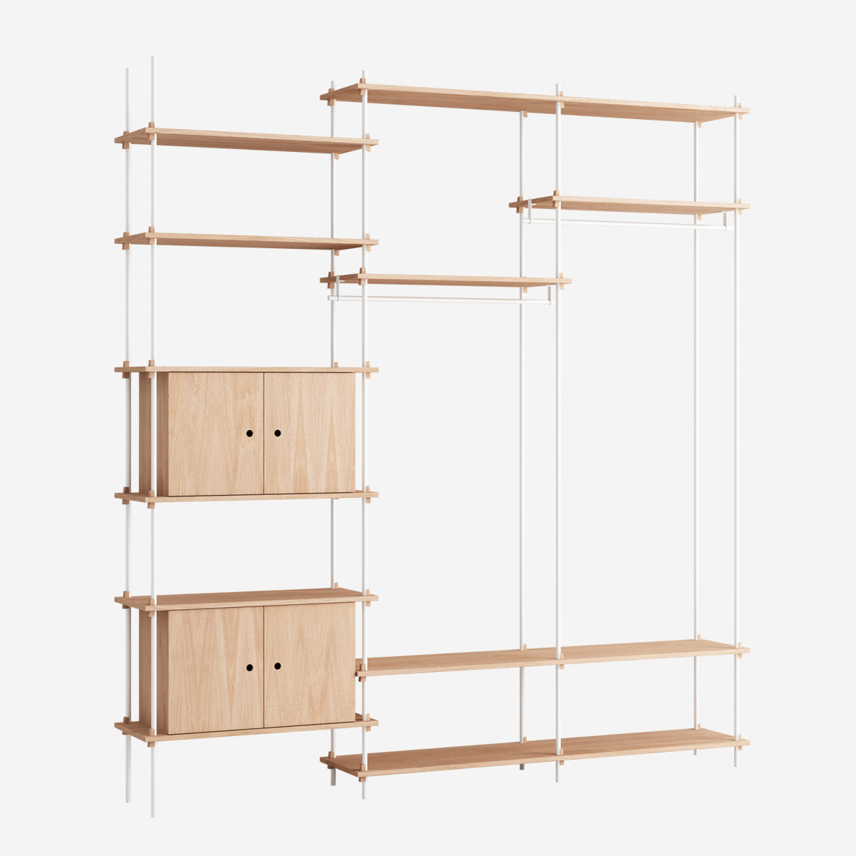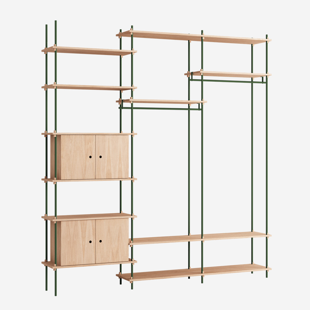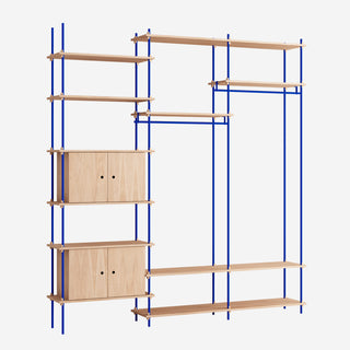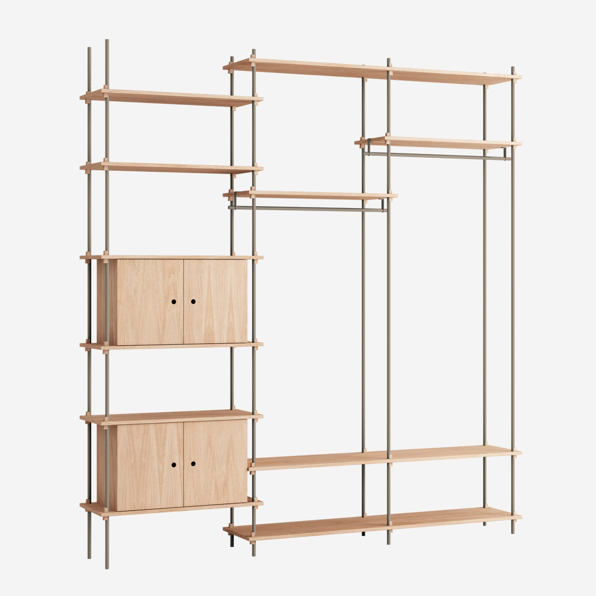 Die Böden und Schrankmodule sind in Eiche Natur und geräuchert, in Schwarz und in Weiß verfügbar. Die Stangen gibt es neben klassischem Schwarz und Weiß auch in Deep Blue, Pine Green, Warm Grey. Durch die Kombination verschiedener Längen, die fast unsichtbar ineinander geschraubt werden, ist fast jede individuelle Höhe konfigurierbar.