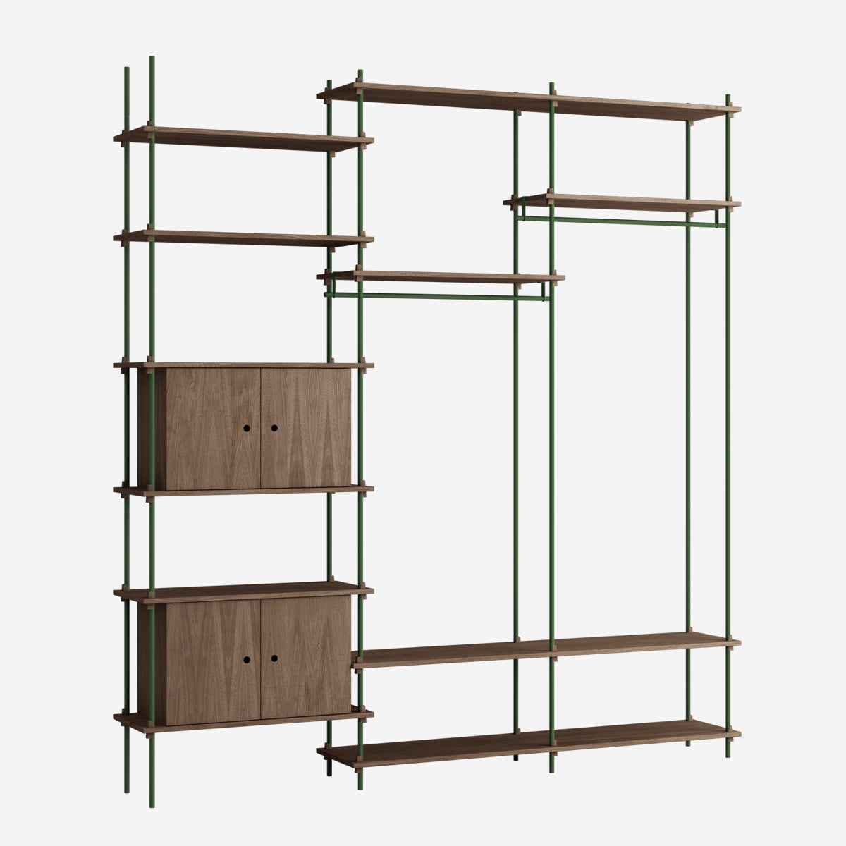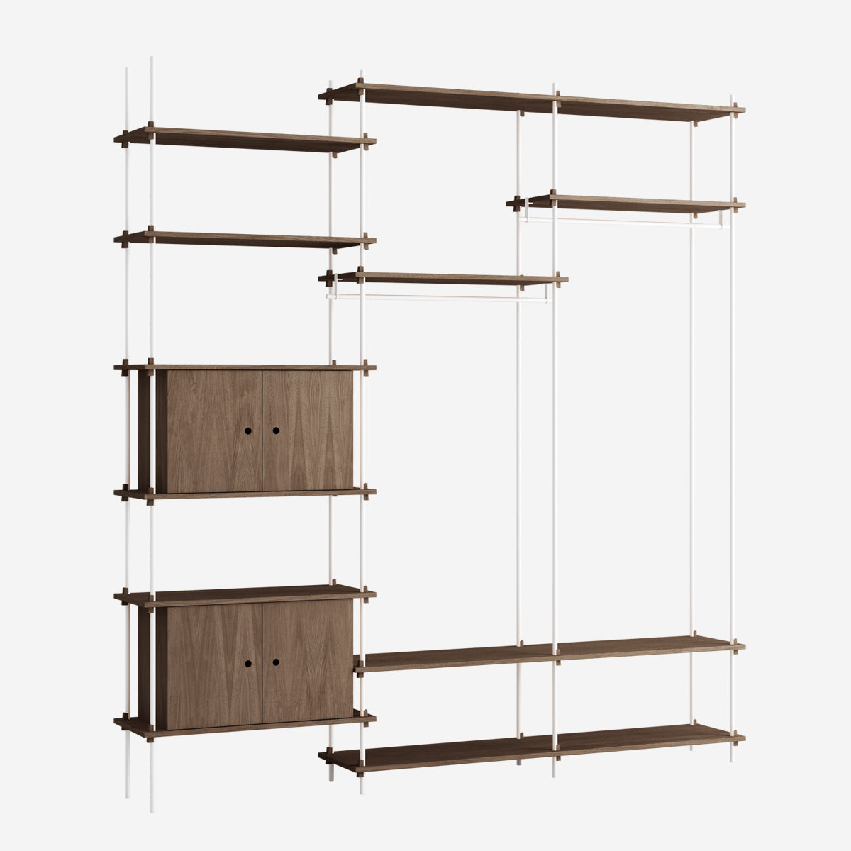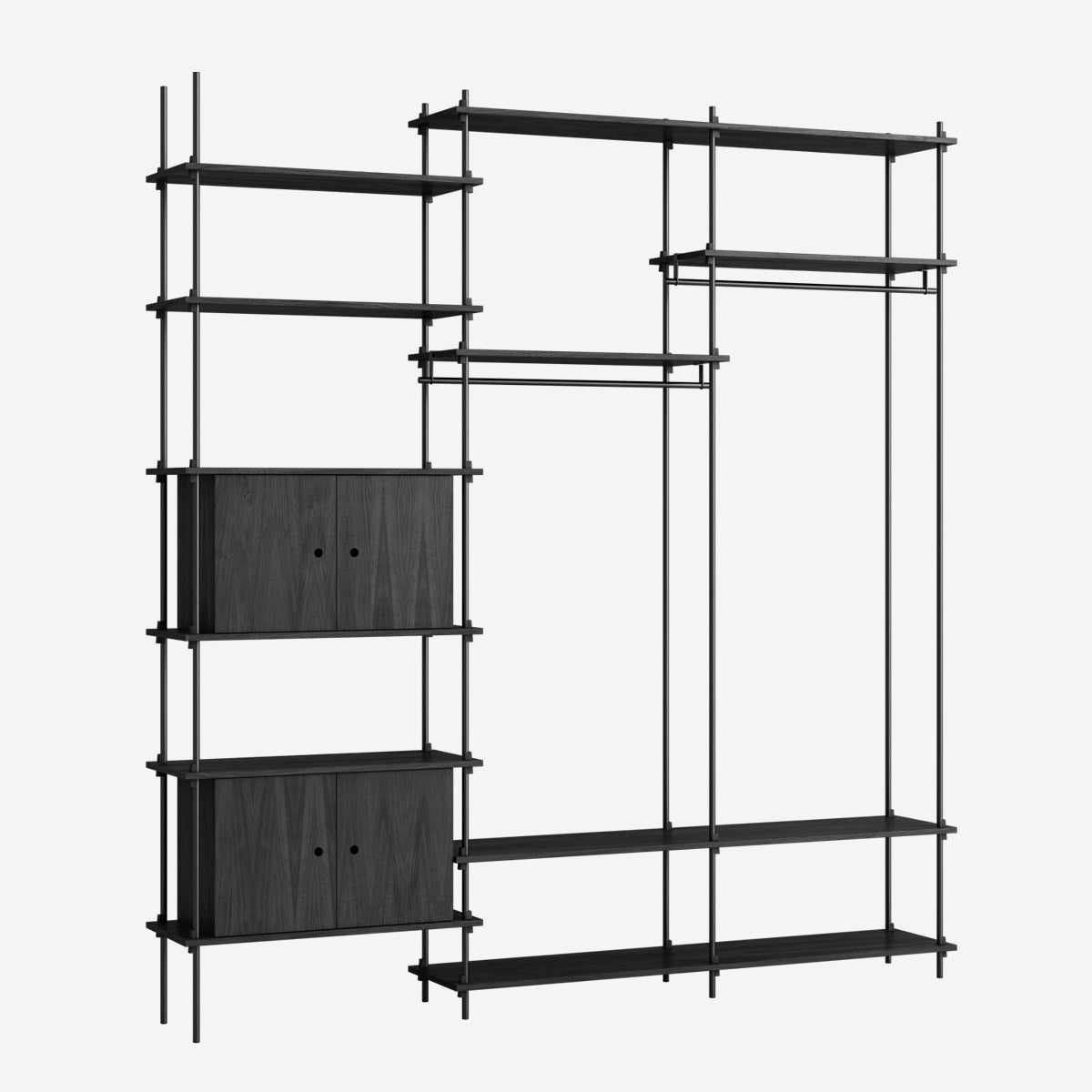 Die Böden und Schrankmodule sind in Eiche Natur und geräuchert, in Schwarz und in Weiß verfügbar. Die Stangen gibt es neben klassischem Schwarz und Weiß auch in Deep Blue, Pine Green, Warm Grey. Durch die Kombination verschiedener Längen, die fast unsichtbar ineinander geschraubt werden, ist fast jede individuelle Höhe konfigurierbar.