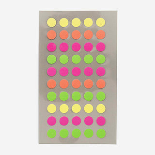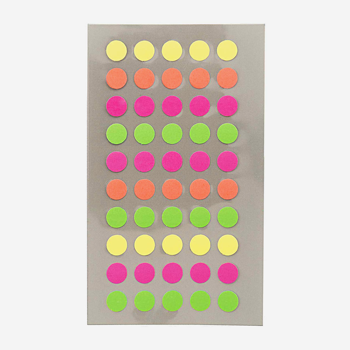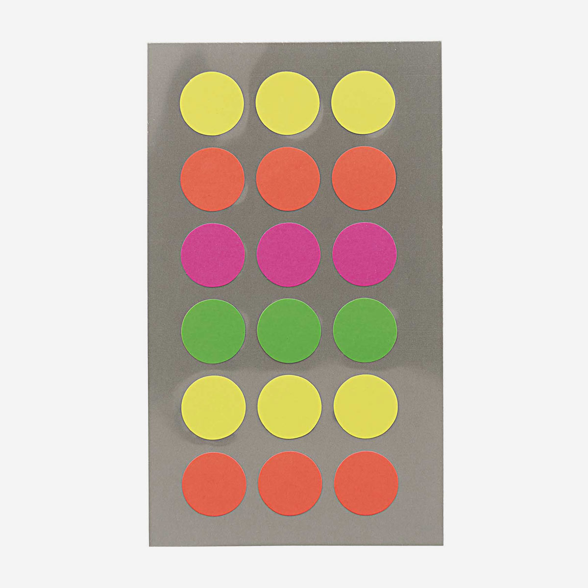 Die knalligen Neonfarben der runden Sticker kommen auf Naturmaterialien, wie zum Beispiel Kraftpapier und Graukarton, besonders gut zur Geltung. Auch überall sonst: Eyecatcher!
