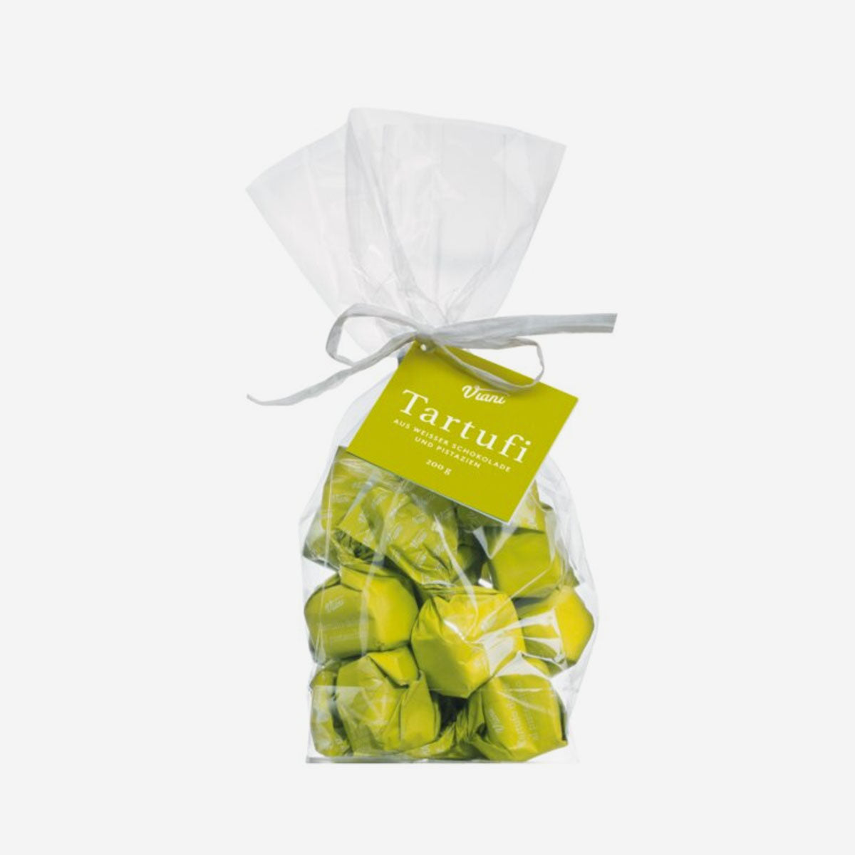 Herrlich aromatische Pistazien unterschiedlicher Herkunft aus einem Betrieb in Bronte, der seit Generationen Pistazien anbaut und verarbeitet, sind die Geschmacksgeber dieser Topseller. Diese Tartufi haben einen ungewöhnlichen, köstlichen und eleganten Geschmack. Die Pralinen besitzen einen angenehmen Biss, dank der kleinen Pistazienstücke, die herrlich zwischen den Zähnen knacken. Der durchsichtige Geschenkbeutel ist ein perfektes Mitbringsel.