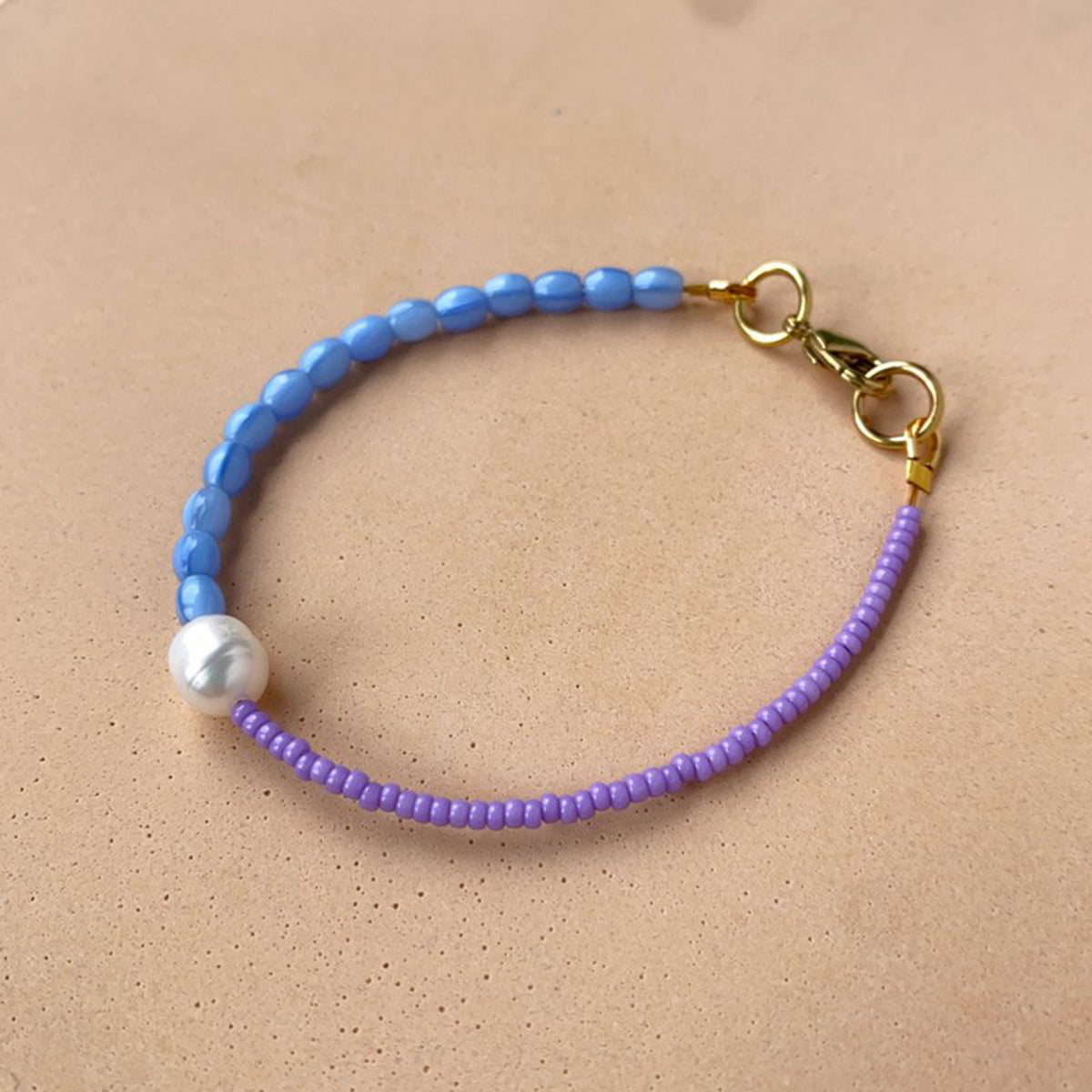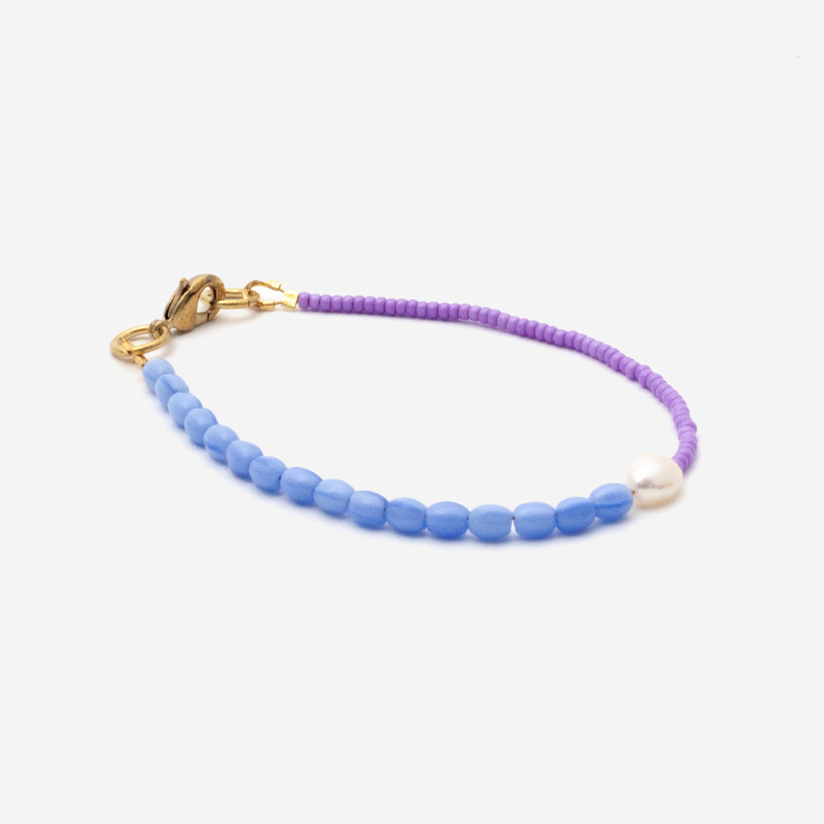 Das Two Tone Bracelet von Loela ist ein handgefertigtes Perlenarmband mit Glasperlen und einer Süßwasserperle als Akzent.
