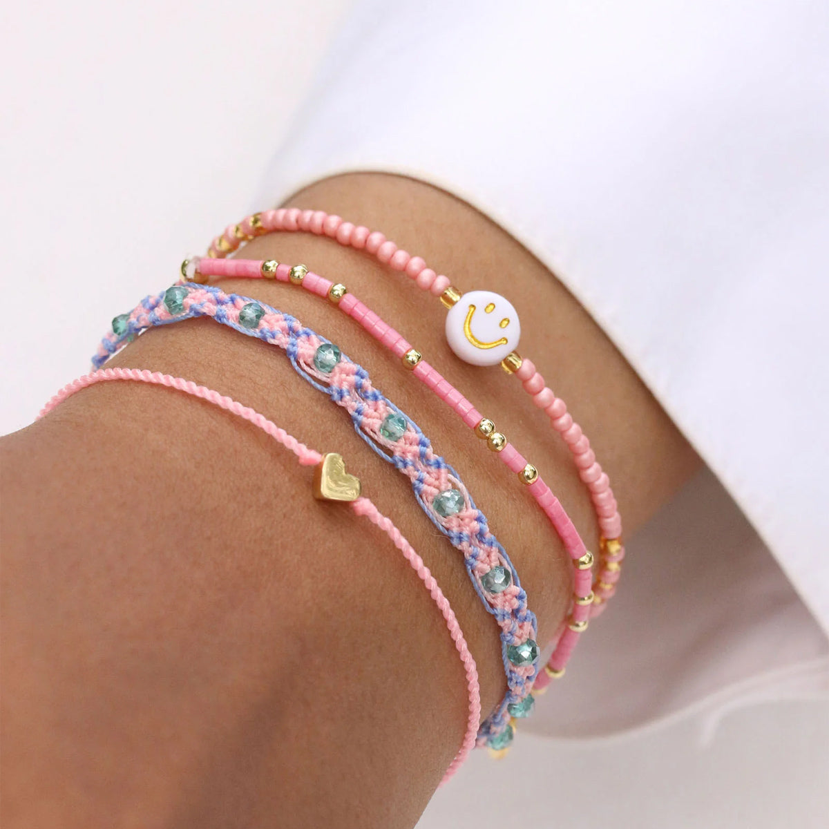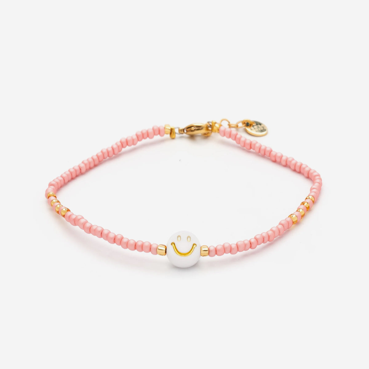 Der Sommer kann kommen! Das Armbändchen Smile ist der zweifarbige Zuckerguss auf deiner Geburtstagstorte. Rosafarbene Roccailles Perlen mit Metallic Schimmer versüßen dein Handgelenk. In der Mitte lächelt eine Smiley-Perle, und vereinzelte goldene Perlen setzen elegante Akzente.