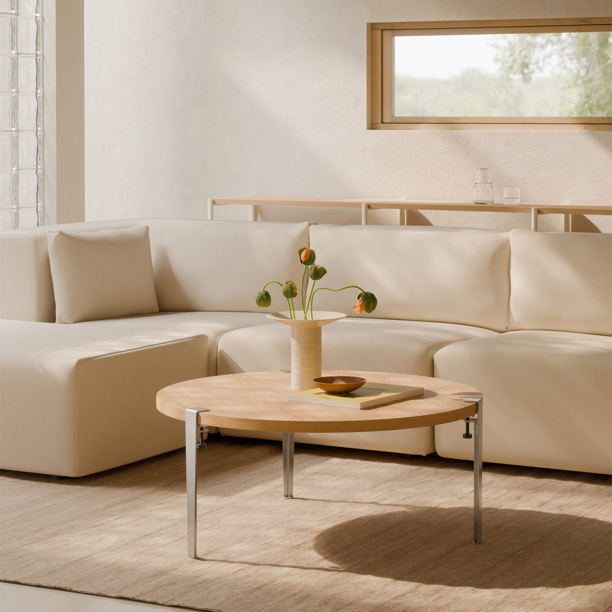 Zur Wahl stehen zwei Formen: rund mit 90 cm Durchmesser oder in einer organischen, kieselsteinähnlichen Form mit 120 × 75 cm. Beide Varianten lassen sich leicht im Wohnraum platzieren – vor dem Sofa, neben dem Sessel oder genau dort, wo eine Ablage fehlt.