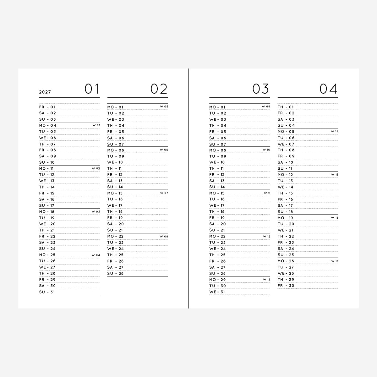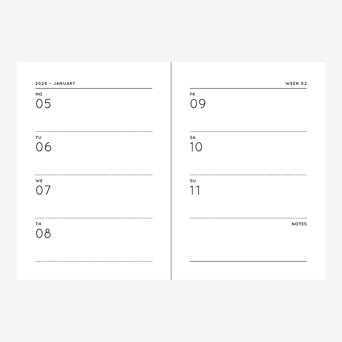 Es gibt einen Jahresüberblick für 2026 und 2027, eine Übersichtsseite pro Monat, Doppelseiten für jede Woche und ein weitere Seiten für Notizen.