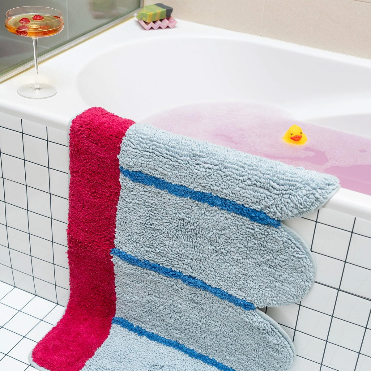 Diese Badematte wirkt wie ein stiller Gruß vom Poolrand. Die Farben bringen eine sanfte Frische ins Bad und bleiben trotzdem mutig genug um nicht übersehen zu werden. Genau die Art Akzent die morgens wach macht und abends alles ein bisschen entspannter aussehen lässt. Weich unter den Füßen und überraschend souverän im Raum.