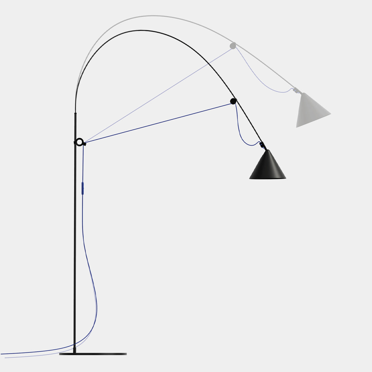 The central feature of the AYNO family of lights is a fiberglass rod, which is stretched into an arch with the lamp cable. The inherent tension of the rod ensures a lamp without any joints. By moving the two adjustment rings on the holder and head of the lamp, the fiberglass rod is bent into the desired position, thus directing the light in the desired direction. The radius of the arch can be changed as desired by moving the adjustment rings. The light can be finely adjusted using the pivoting lampshade.