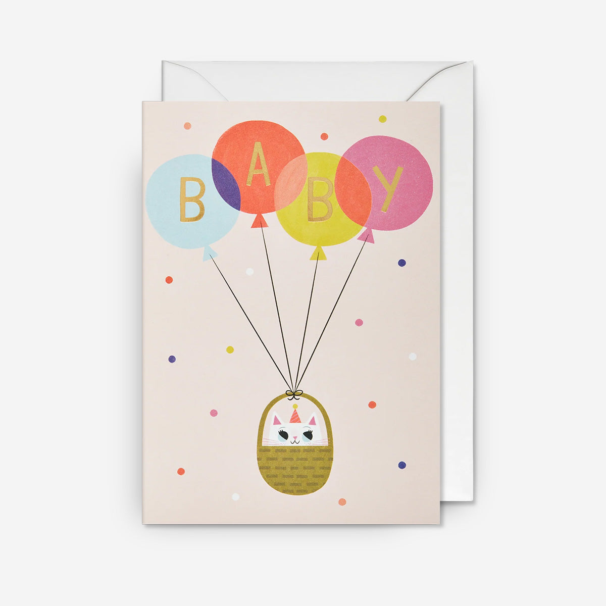 Ein neues Abenteuer beginnt – und diese Katze ist bereit für den großen Auftritt. In einem kleinen Korb schwebt sie an vier bunten Ballons durch die Luft, begleitet von fröhlichem Konfetti und einer klaren Botschaft: BABY!