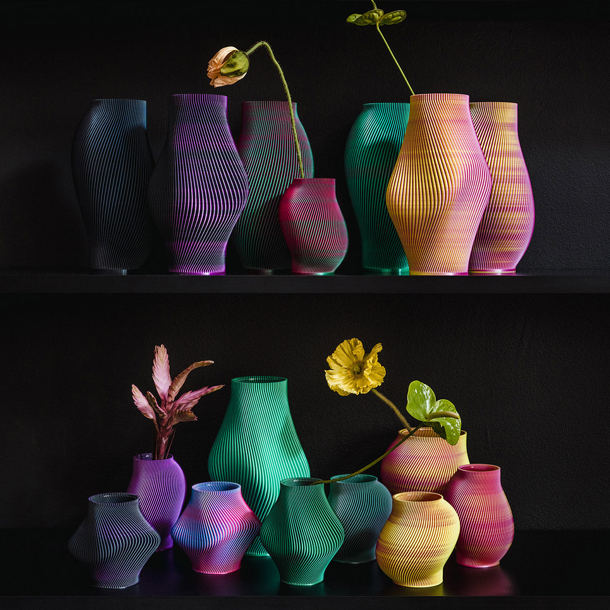 Die Vasen von Sheyn. aus Wien mit ihren spannenden Texturen und ausgewogenen, interessanten Formen werden im 3D-Druck hergestellt. Die Vasen sind innen mit einem genau passenden, herausnehmbaren Glas bestückt, in das du das Wasser einfüllen kannst. Ein weiteres Plus: das verwendete Material auf der Basis von Mais ist nachhaltig und recycelbar.