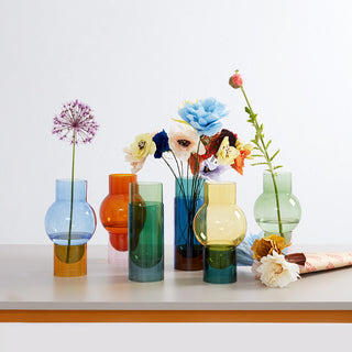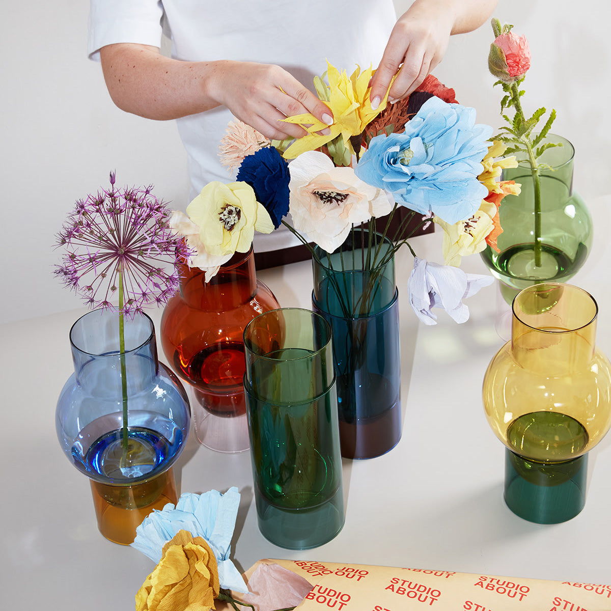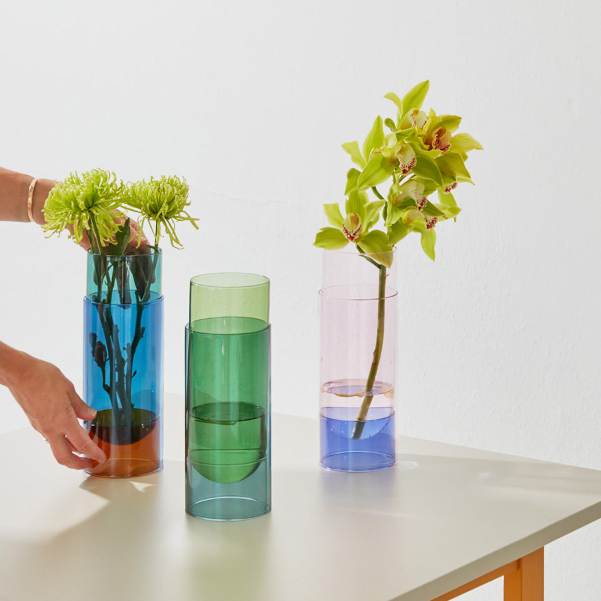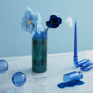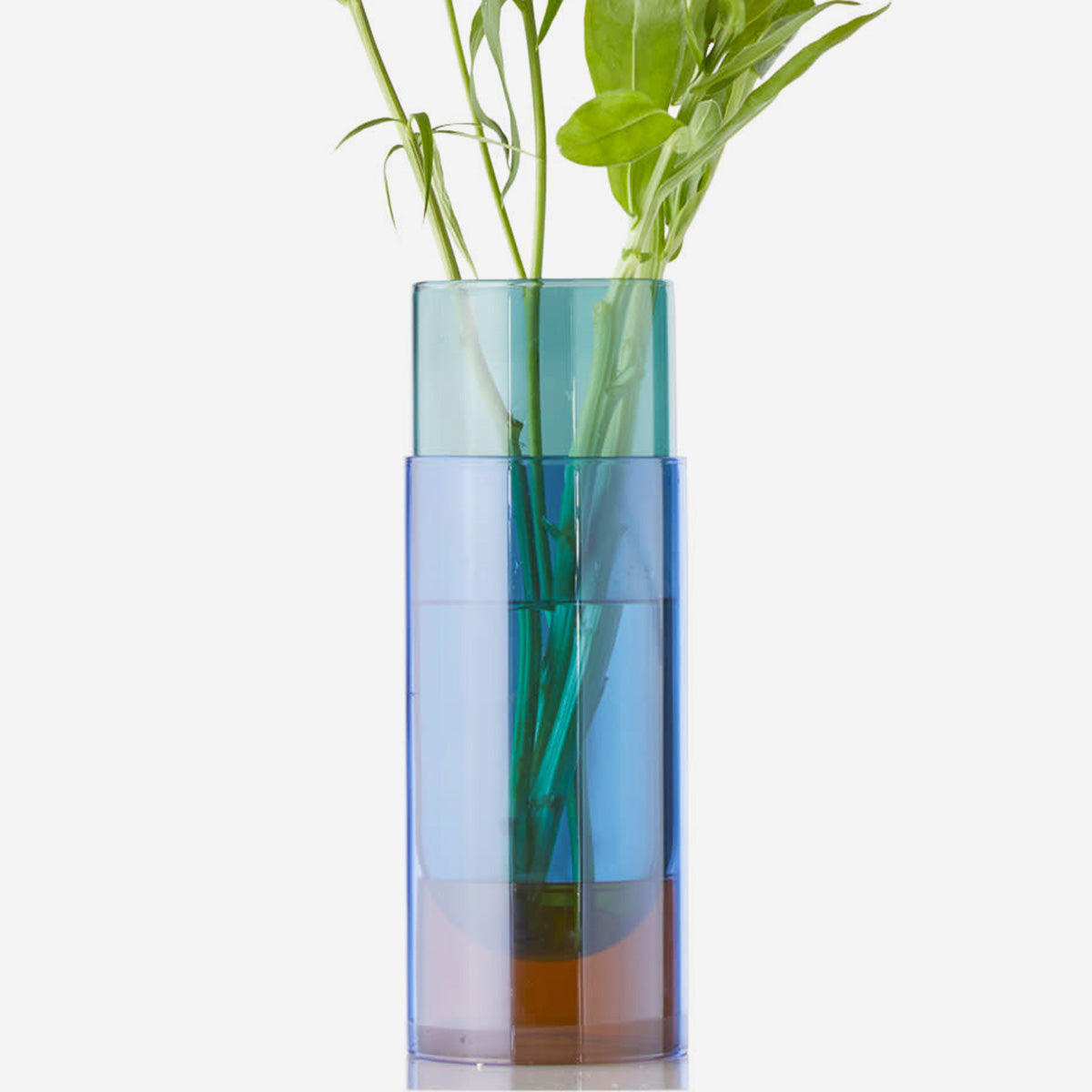 Die Bouquet Tube Vase von Studio About spielt mit Dimensionen und Farben und zieht mit ihrem ungewöhnlichen Design die Blicke auf sich. Sie besteht aus drei Elementen: einer cyanfarbenen Glasröhre, die auf einem Sockel aus warmem Braunglas ruht, und einer äußeren Hülle in intensivem Blau. Diese Kombination verleiht der Vase eine besondere Tiefe und Lebendigkeit.