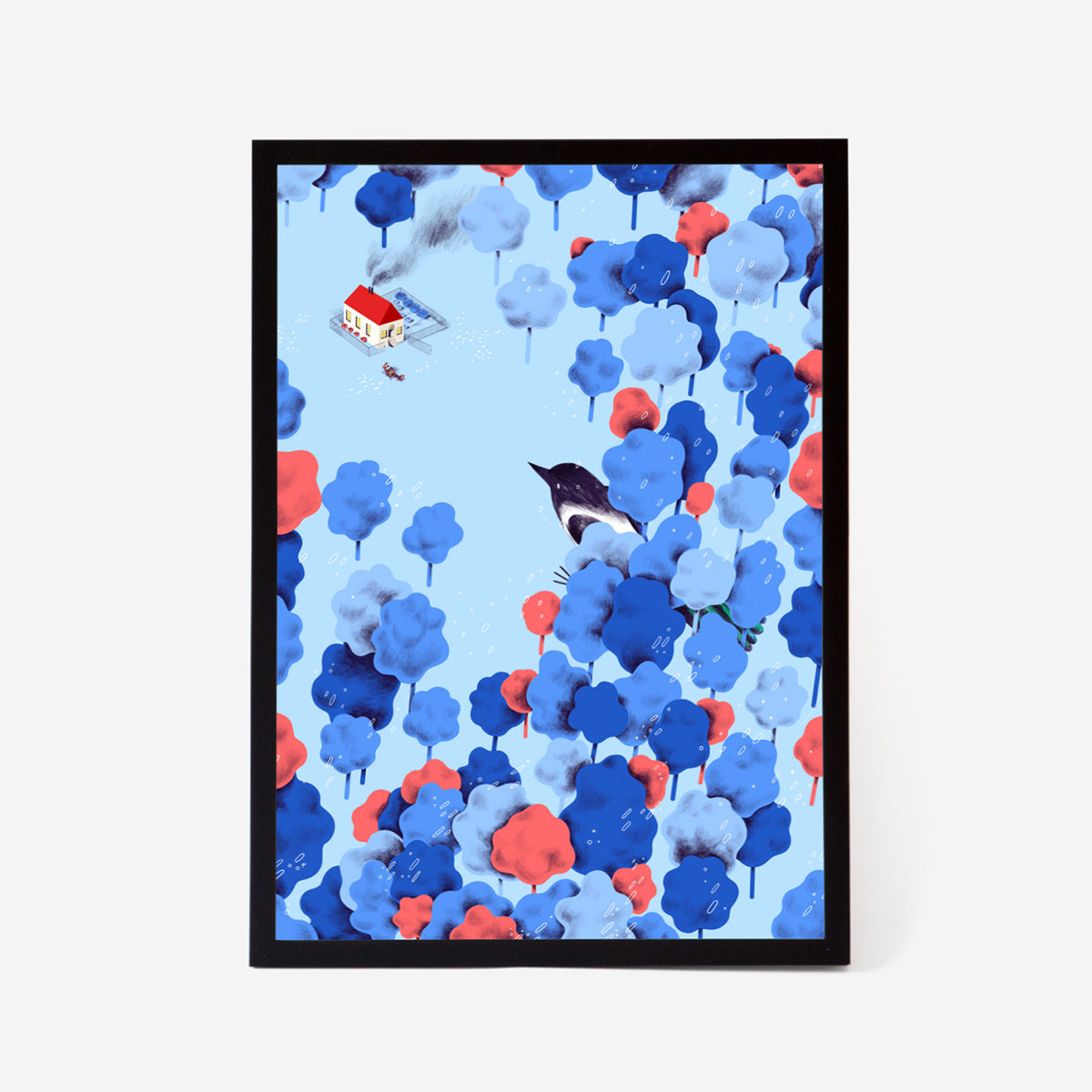 A beautiful eye-catcher not only in the children's room: The Forest Blue art print by illustrator Daria Rychkova aka Eyes Wide Open.
