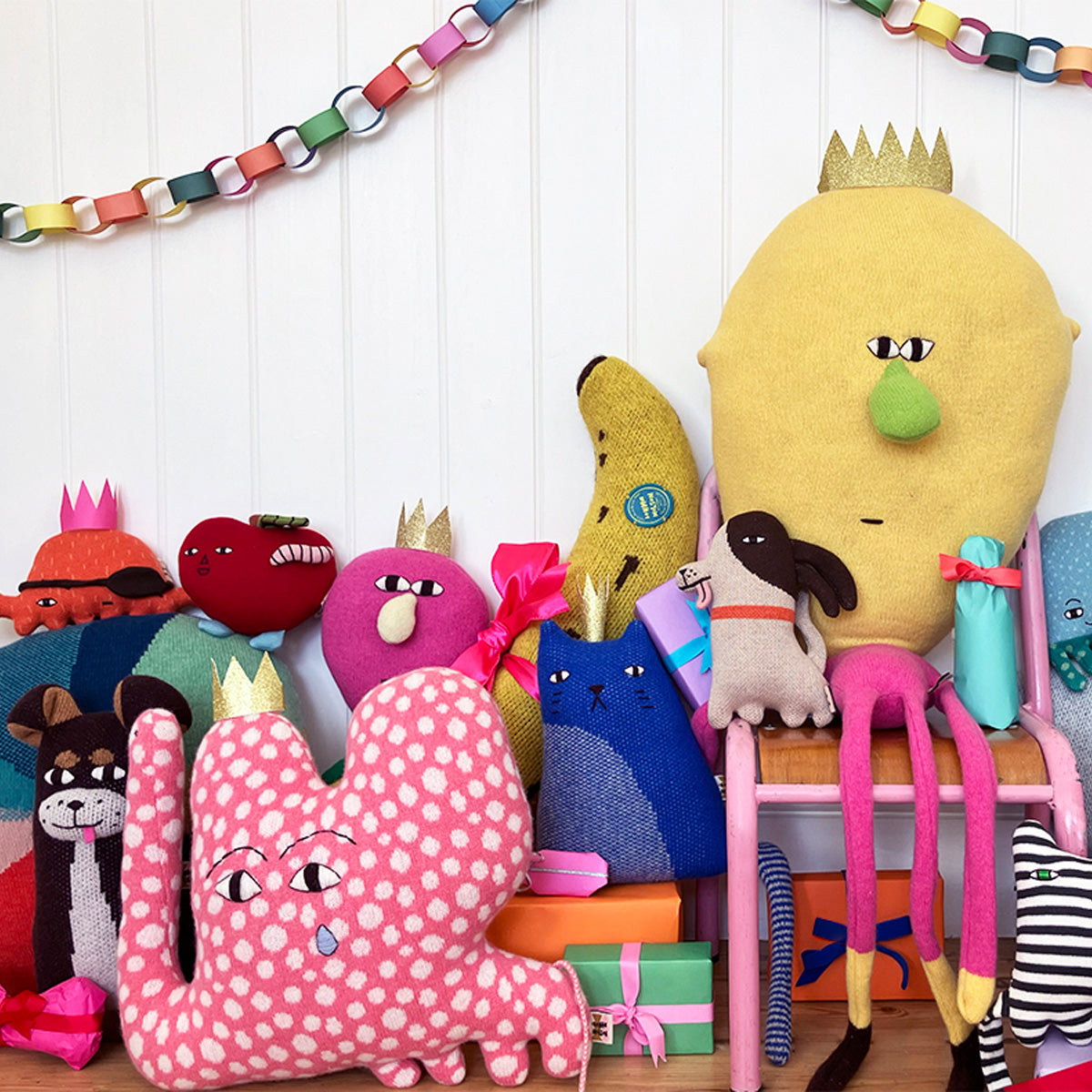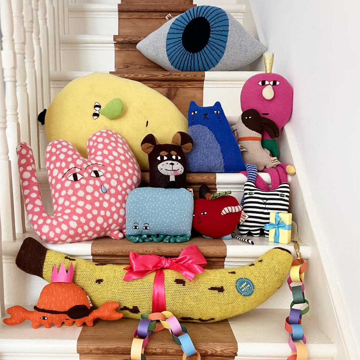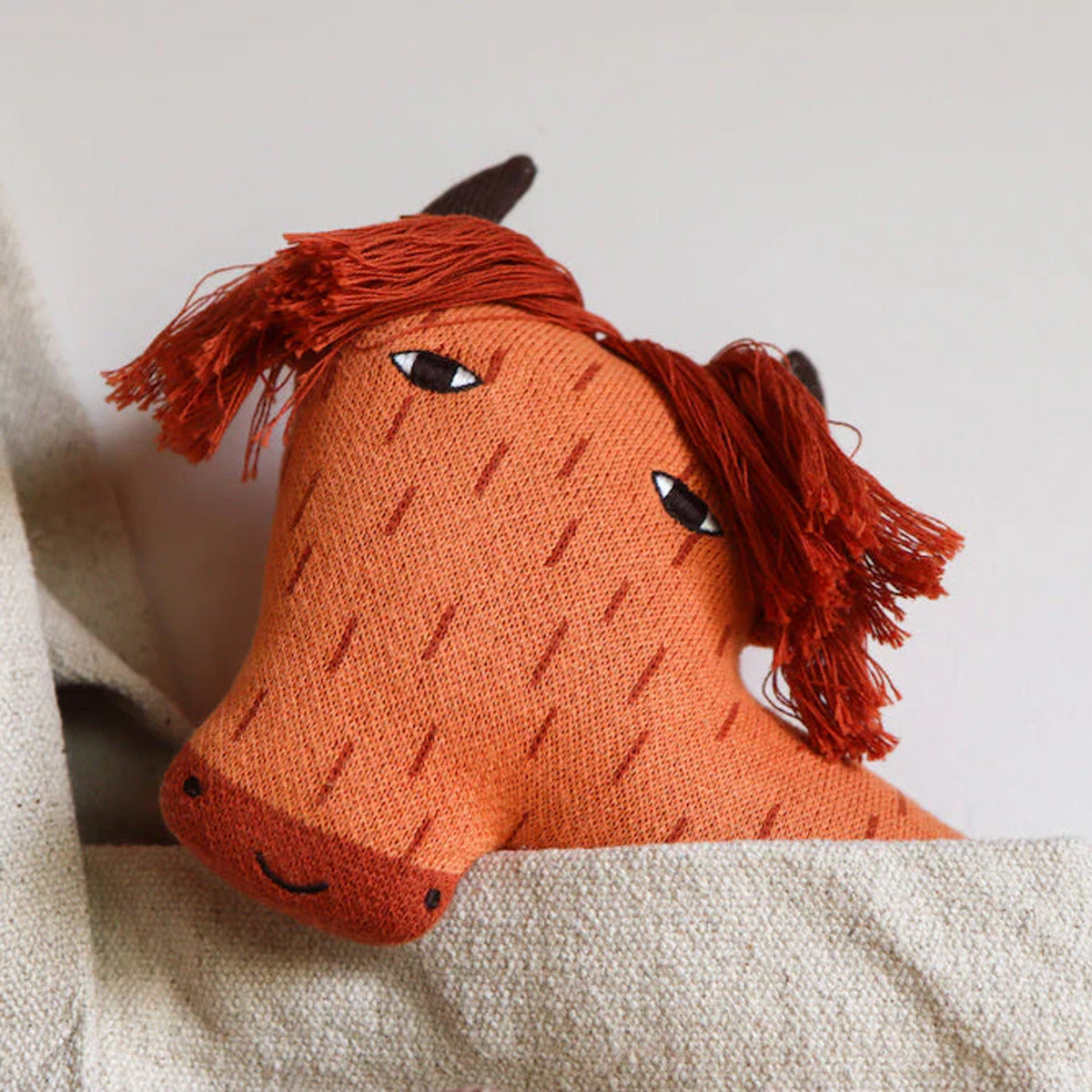 Harriet kommt mit einem langen Fransenschopf daher, der ihr halbes Gesicht verdeckt und sie trotzdem ziemlich zufrieden aussehen lässt. Ihre kleinen Hörner stehen ruhig nach oben, der Körper ist weich gestrickt und trägt feine Strichmuster. In der Hand fühlt sie sich warm und nachgiebig an. Eine kleine Hochlandkuh, die sofort Nähe sucht und sich sowohl im Kinderzimmer als auch auf dem Sofa gut macht.