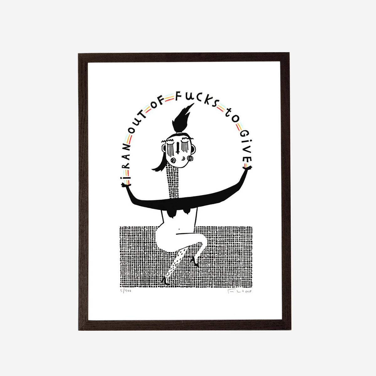 "I Ran Out of Fucks to Give" is a handmade linocut on lightly textured white paper.
