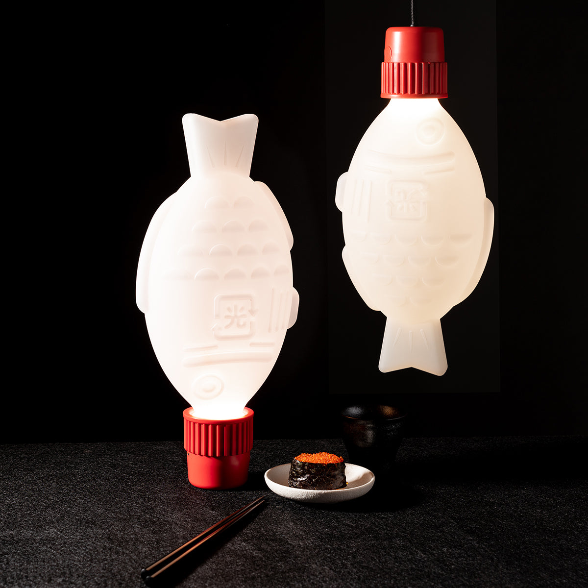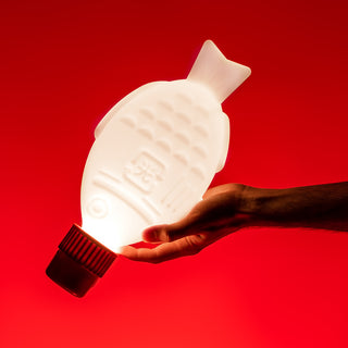 Portable USB-C rechargeable LED light in the shape of a soy fish