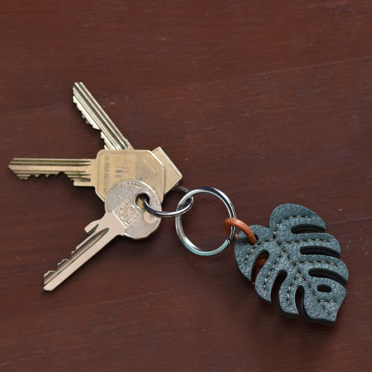 Wunderschöner handgemachter Schlüsselanhänger aus Kuh-Leder in Form eines Monstera-Blattes.