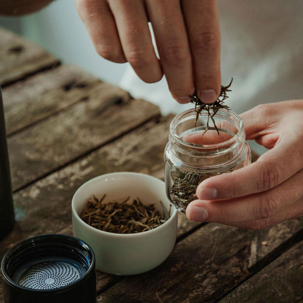 Tea to go! Die Nomad Bottle ist eine isolierte Glasflasche zum Aufbrühen und Trinken von Tee unterwegs.
