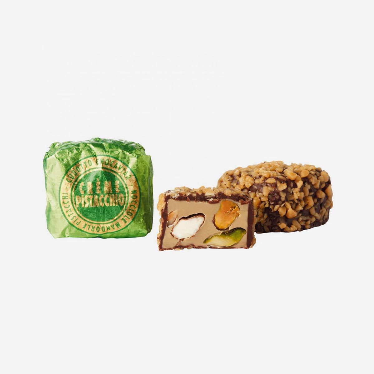 Sugar, caramel (sugar, glucose syrup, cream, butter), cocoa butter, cocoa mass, hazelnut paste, pistachio paste , whole milk powder, salted almonds (almonds 98.5%, salt), salted hazelnuts ( hazelnuts 98.5%, salt), salted pistachios ( pistachios 98.5%, salt), whey powder, emulsifier: soy lecithin , natural flavoring (vanilla), may contain traces of other nuts