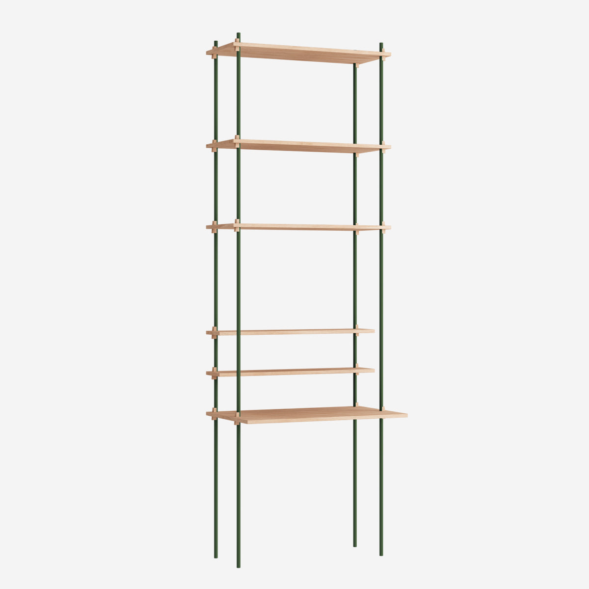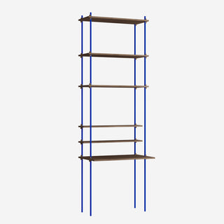 Die Böden und Schrankmodule sind in Eiche Natur und geräuchert, in Schwarz und in Weiß verfügbar. Die Stangen gibt es neben klassischem Schwarz und Weiß auch in Deep Blue, Pine Green, Warm Grey. Durch die Kombination verschiedener Längen, die fast unsichtbar ineinander geschraubt werden, ist fast jede individuelle Höhe konfigurierbar.