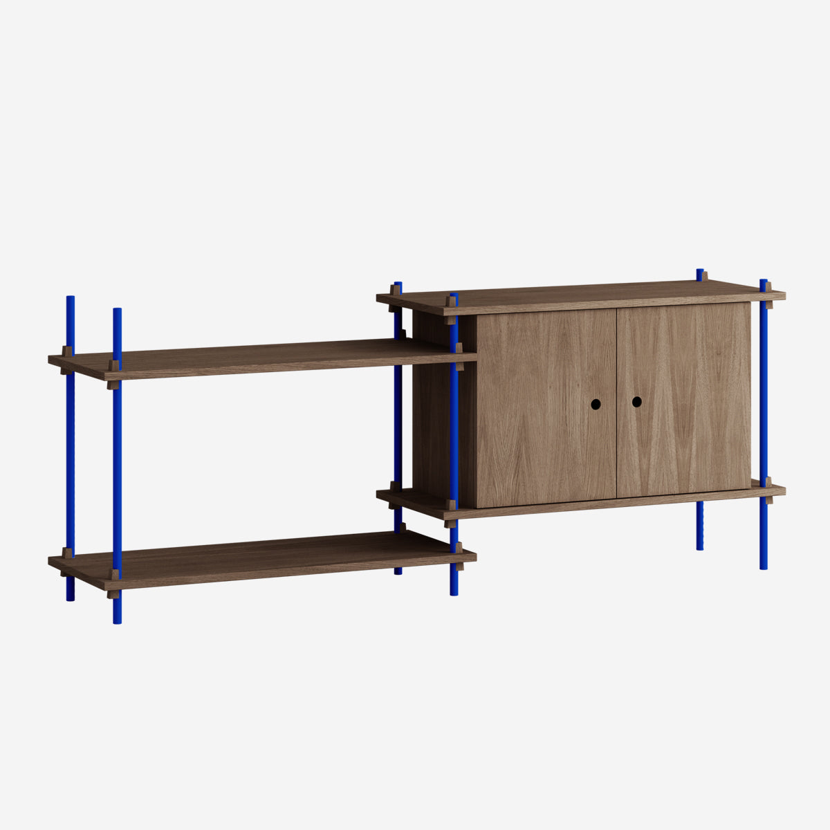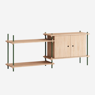 Die Böden und Schrankmodule sind in Eiche Natur und geräuchert, in Schwarz und in Weiß verfügbar. Die Stangen gibt es neben klassischem Schwarz und Weiß auch in Deep Blue, Pine Green, Warm Grey. Durch die Kombination verschiedener Längen, die fast unsichtbar ineinander geschraubt werden, ist fast jede individuelle Höhe konfigurierbar.