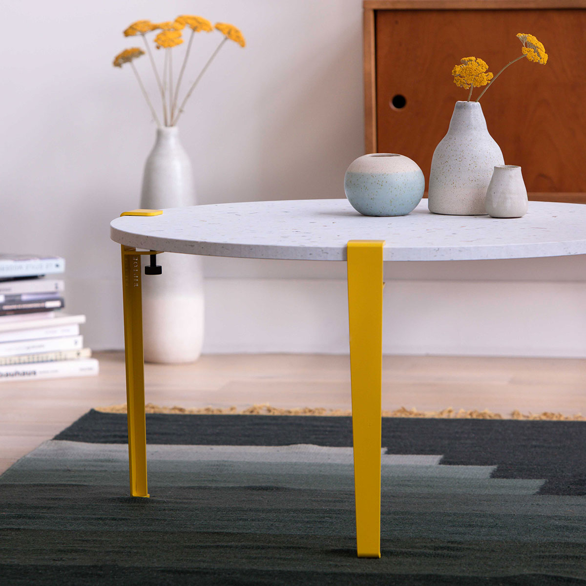 Low table with 3 TIPTOE 43 cm legs and a round table top with a diameter of 80 cm, made from 100% recycled and recyclable plastic - yes, this table top was 100 yoghurt cups in its first life!