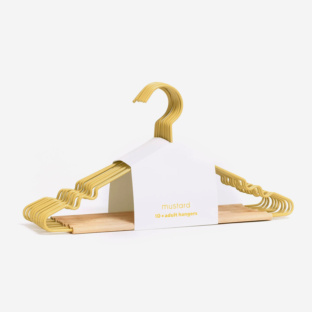 Richtig schöne Kleiderbügel! Die bunten, matt pulverbeschichteten Hanger sind in allen Mustard-Farben erhältlich. Sie haben ein Holzdetail und den mustard-Signature-Kringel an den Seiten.