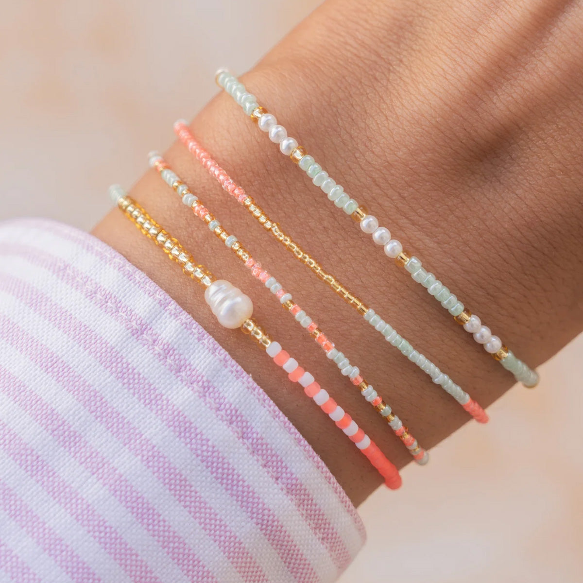 Das Armband Nusa Lembongan mixt zarte Süßwasserperlen mit einem frischen Hauch Sommer. Jedes Stück handgemacht auf Bali, jede Perle ein kleines Versprechen von Sonne, Leichtigkeit und Salzwasserhaut.