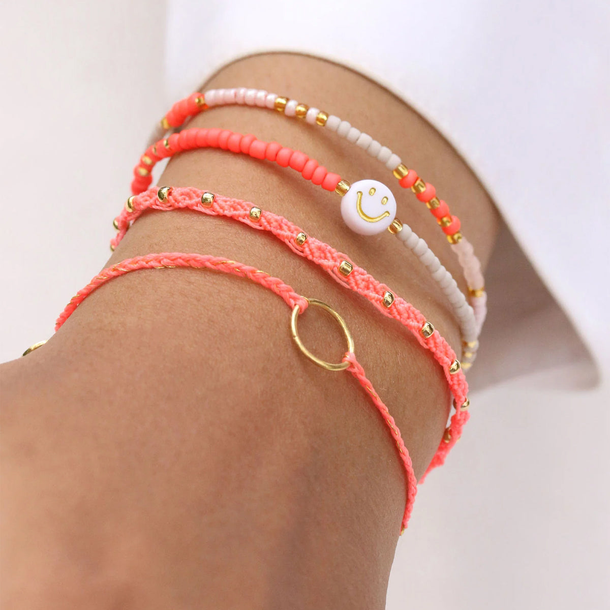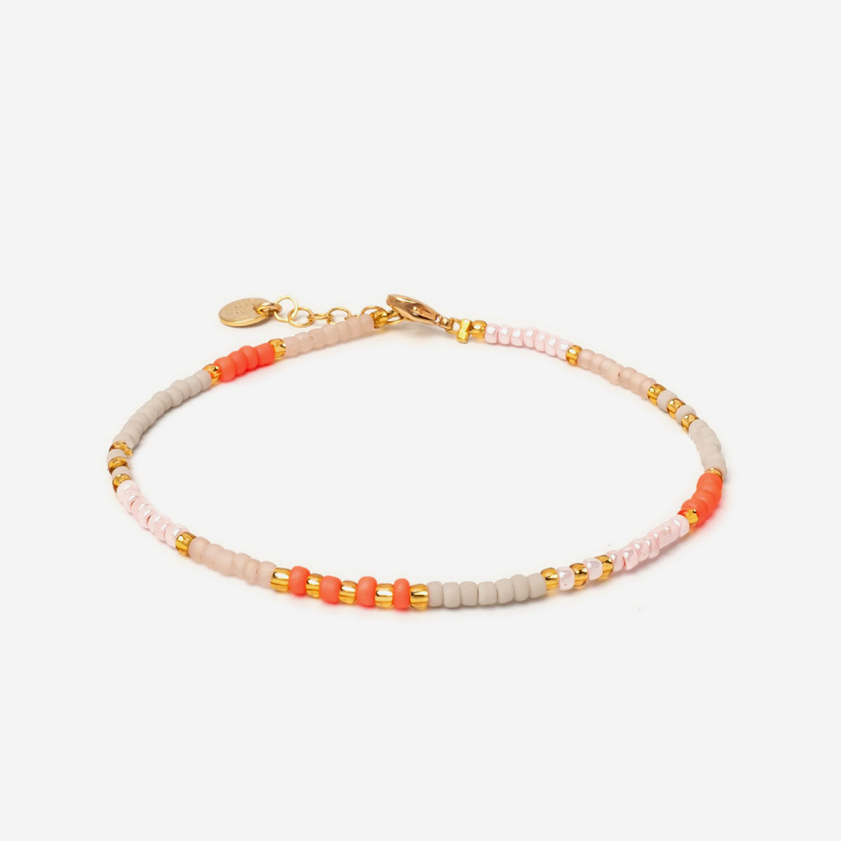 Ein Musthave für die Neon-Lover! Das Armband Santa Fe kombiniert matte Glasperlen in Neon Coral mit glänzenden Perlen in Ivory. Schwarz gestreifte Keramikperlen und vereinzelte goldene Perlen machen das Schmuckstück zum Sommerliebling an deinem Handgelenk.