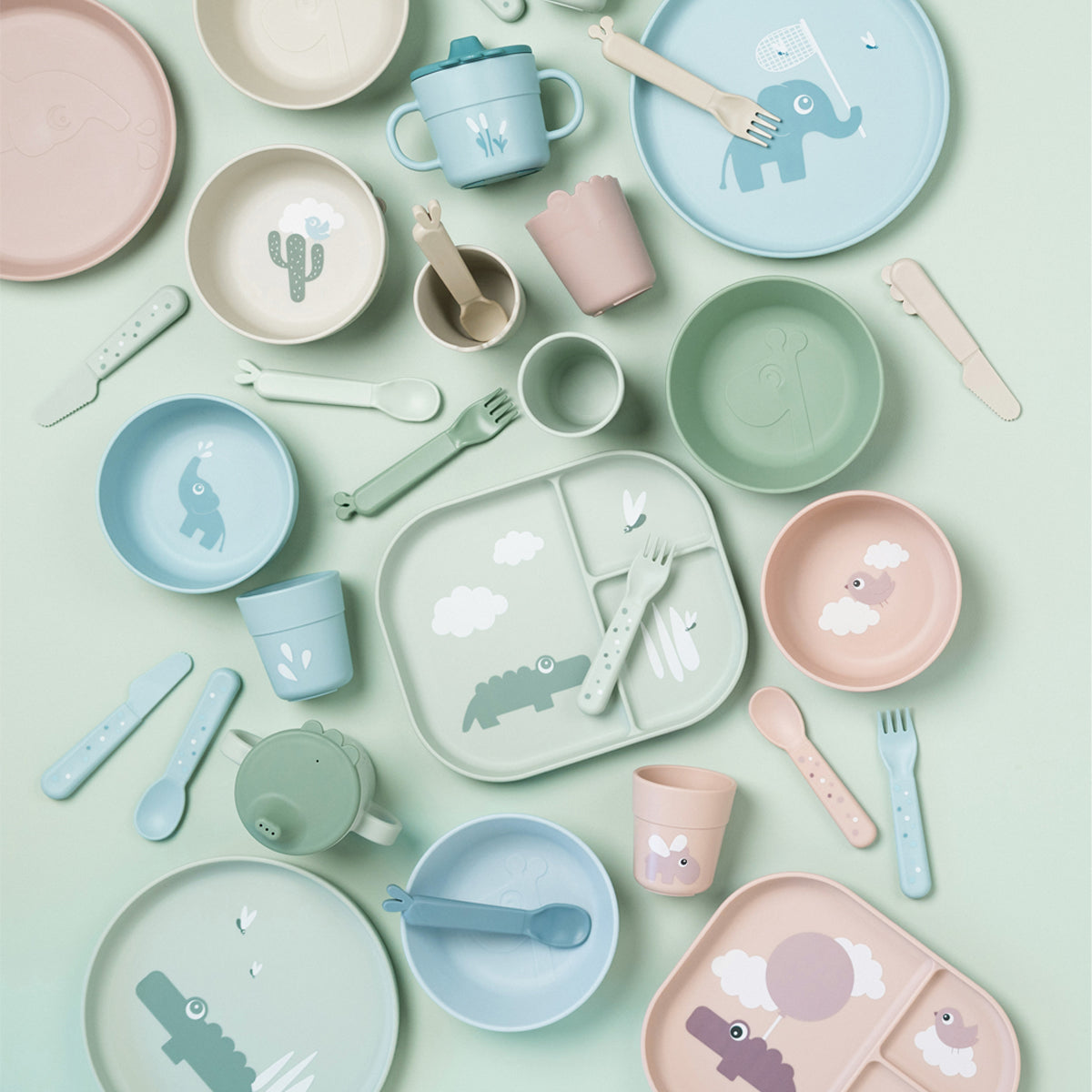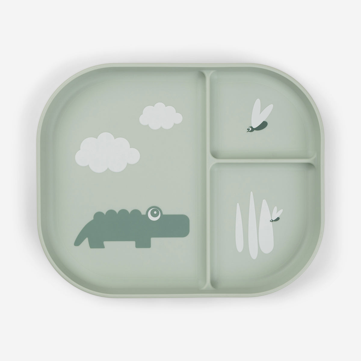 Optisch bringt Croco gute Laune mit – das neugierige Krokodil schaut auf dem grün bedruckten Teller ein paar Glühwürmchen an. Der dunklere Grünton am Boden sorgt für ein schönes, zweifarbiges Detail.