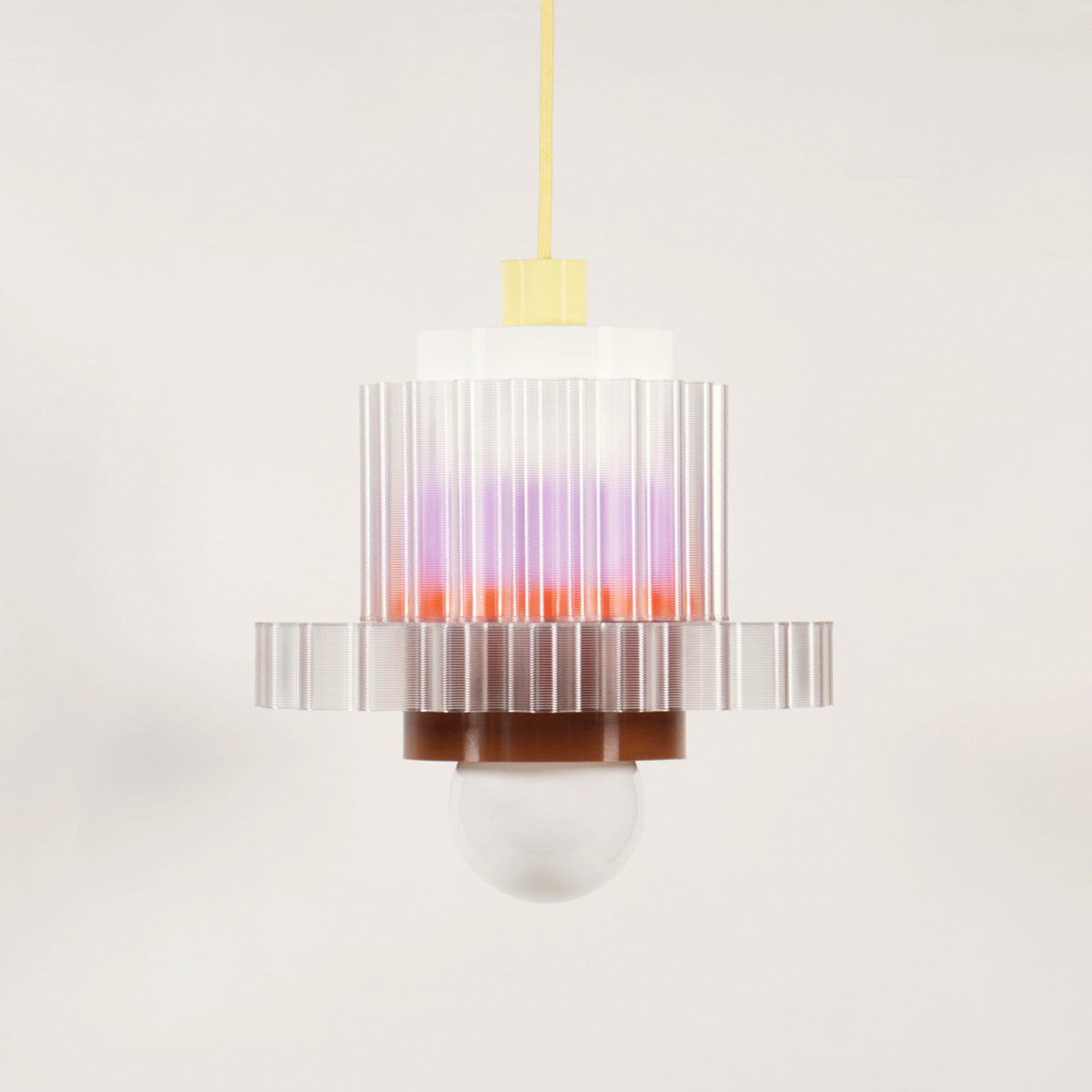 Die Gigi Leuchten werden im 3D-Druckverfahren im Pariser Studio aus recycelten und wiederverwertbaren Plastikflaschen sowie industriell kompostierbarem Biokunststoff aus Maisstärke (rPETG + PLA) hergestellt.
