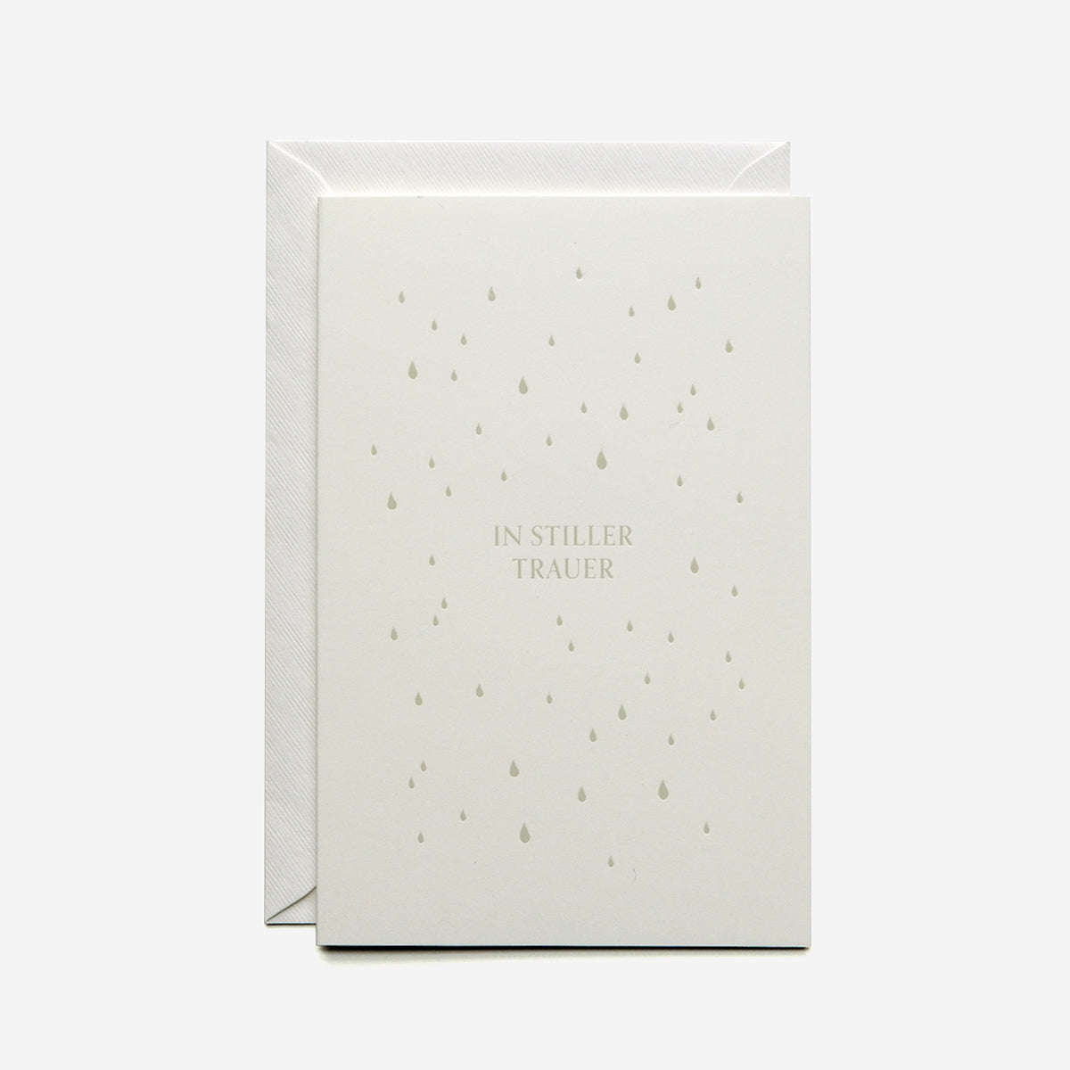 Stilvolle Kondolenzkarte / Trauerkarte mit stilisierten Tränen. Die Karte ist auf feinem, strukturiertem Papier produziert und kommt mit einem hochwertigem Umschlag.