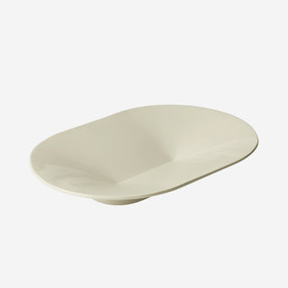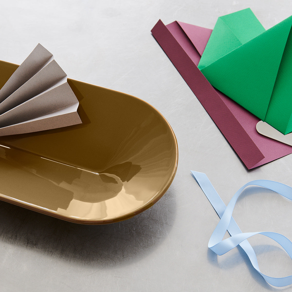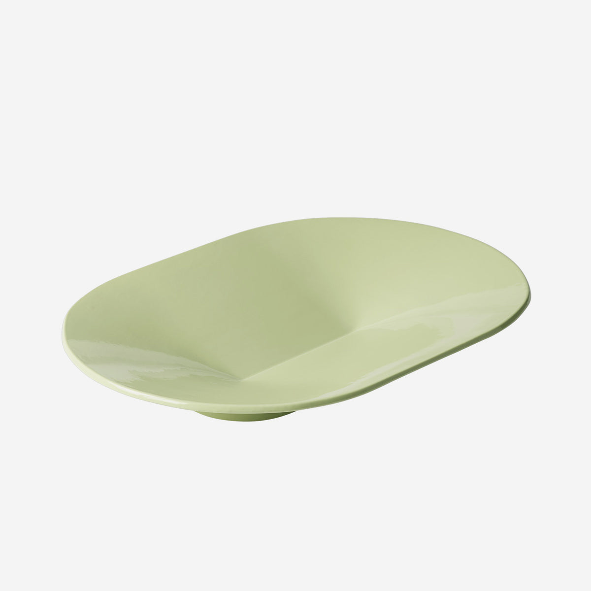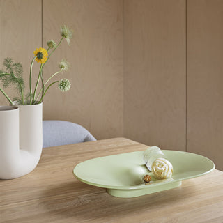 Die Mere Bowl ist ein skulpturaler Mittelpunkt auf dem Tisch. Sie fügt sich harmonisch in den Raum ein, egal ob sie gefüllt wird oder nicht. Ihre charakteristische Form ist einfach und doch raffiniert: die Linie in der Mitte faltet sich zu den Seiten hin und bildet eine Schale. Durch einen diskreten Fuß erhöht scheint sie zu schweben. Die Schale ist aus taktilem Steinzeug gefertigt und mit einer hochglänzenden Glasur überzogen, die die Schatten, die sich entlang der Faltung von Mere Bowl bilden, hervorhebt. Diese Oberflächenbehandlung macht die Schale lebensmittelecht.