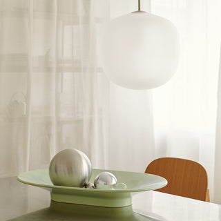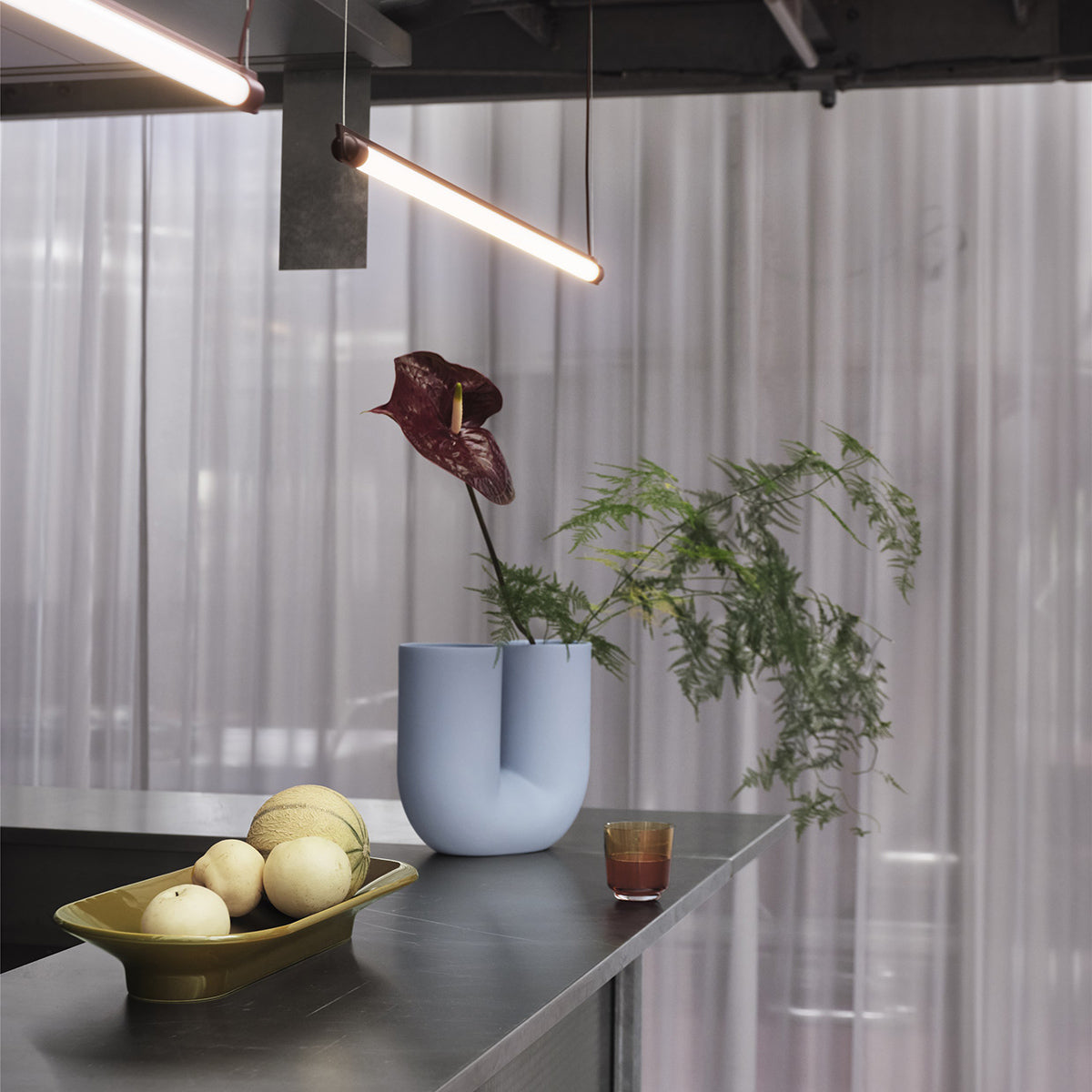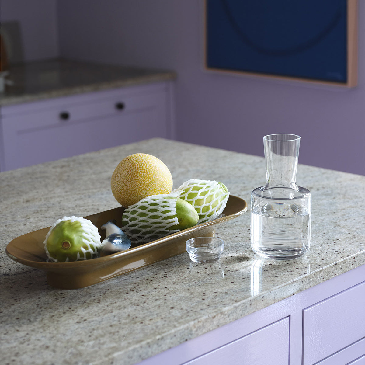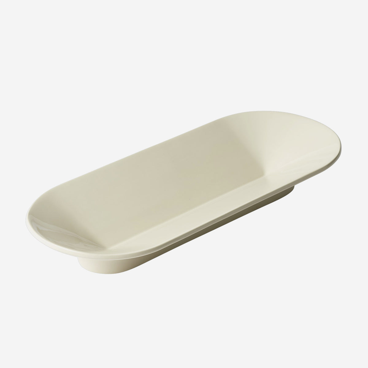Die Mere Bowl ist ein skulpturaler Mittelpunkt auf dem Tisch. Sie fügt sich harmonisch in den Raum ein, egal ob sie gefüllt wird oder nicht. Ihre charakteristische Form ist einfach und doch raffiniert: die Linie in der Mitte faltet sich zu den Seiten hin und bildet eine Schale. Durch einen diskreten Fuß erhöht scheint sie zu schweben. Die Schale ist aus taktilem Steinzeug gefertigt und mit einer hochglänzenden Glasur überzogen, die die Schatten, die sich entlang der Faltung von Mere Bowl bilden, hervorhebt. Diese Oberflächenbehandlung macht die Schale lebensmittelecht.