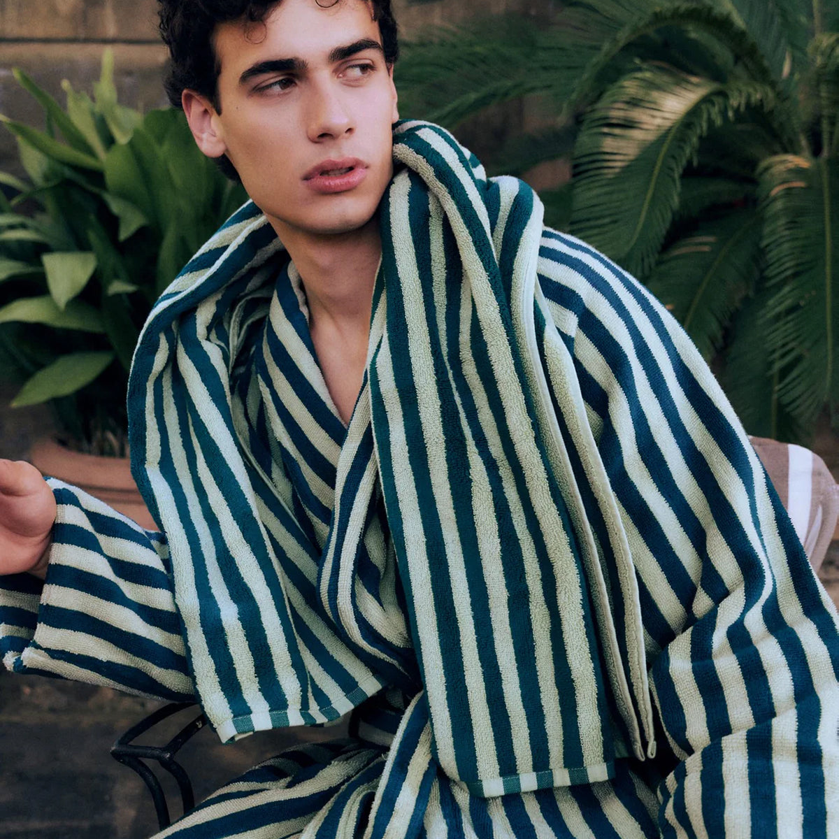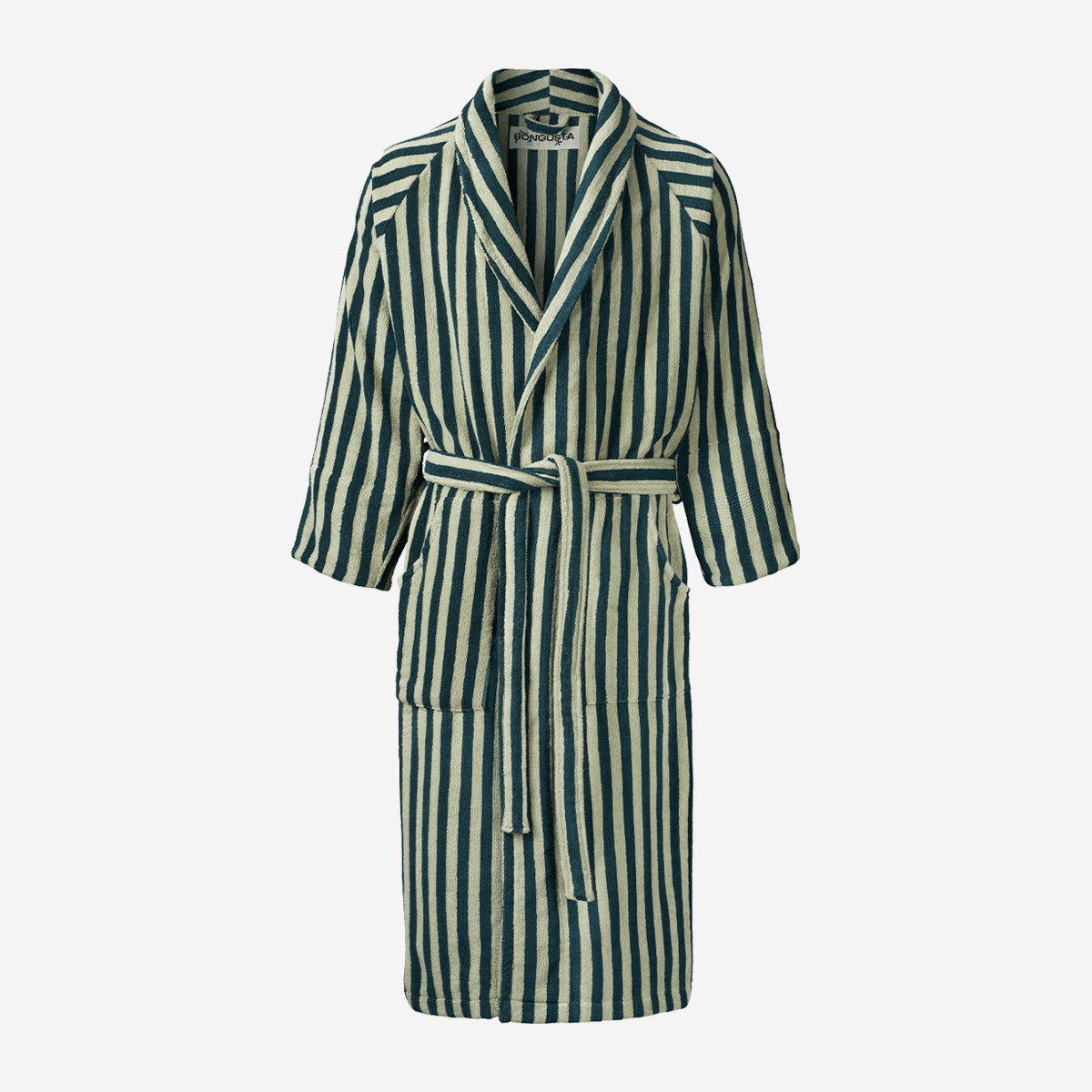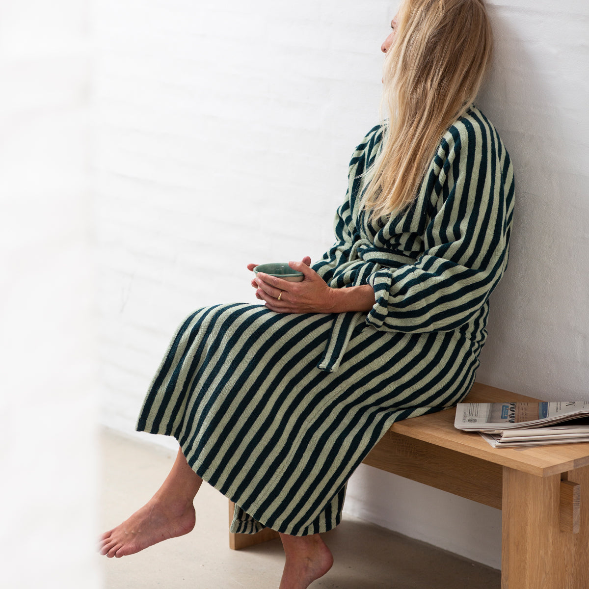 Der Naram Bathrobe von Bongusta ist genau das Richtige für langsame Morgen und lange Abende. Aus 100 % Bio-Baumwolle gewebt, weich, saugfähig und herrlich gemütlich. Das doppelte Garn sorgt für Volumen und einen Stoff, der sich anfühlt wie eine Umarmung. Mit Schalkragen, Bindegürtel und zwei großen Taschen bringt er Hotelgefühl ins eigene Zuhause. In sanften Farben und Streifen wird aus einem Alltagsmoment ein kleiner Luxus – ganz ohne Eile.