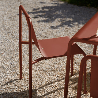 Der PANORAMA Gartenstuhl zeigt, wie elegant Minimalismus im Outdoor-Bereich aussehen kann. Aus gebogenem Stahlblech gefertigt, bringt er eine ruhige, fast skulpturale Präsenz mit – zurückhaltend im Design, überzeugend im Komfort.