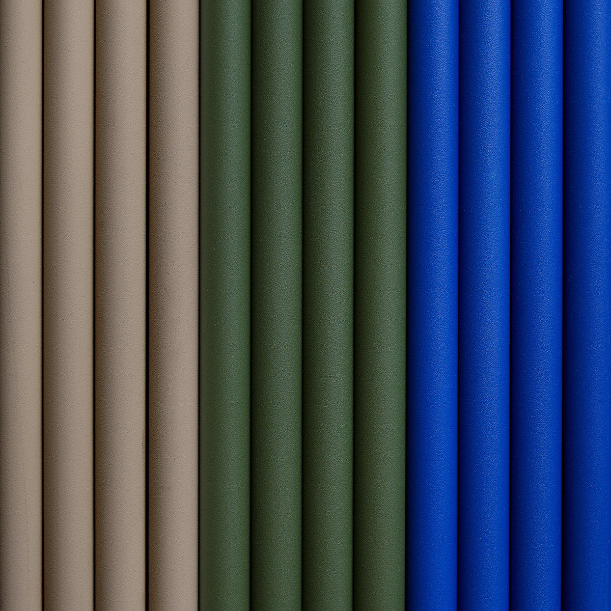 Die Böden und Schrankmodule sind in Eiche Natur und geräuchert, in Schwarz und in Weiß verfügbar. Die Stangen gibt es neben klassischem Schwarz und Weiß auch in Deep Blue, Pine Green, Warm Grey. Durch die Kombination verschiedener Längen, die fast unsichtbar ineinander geschraubt werden, ist fast jede individuelle Höhe konfigurierbar.