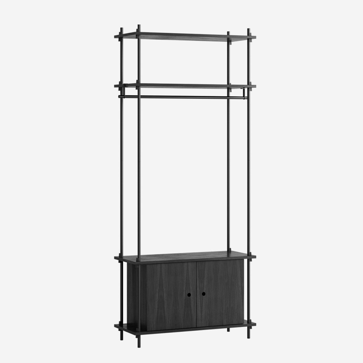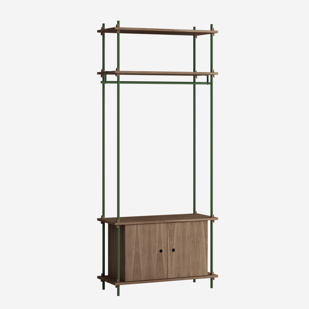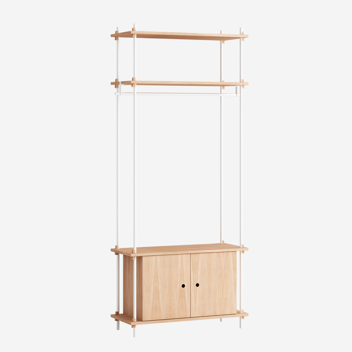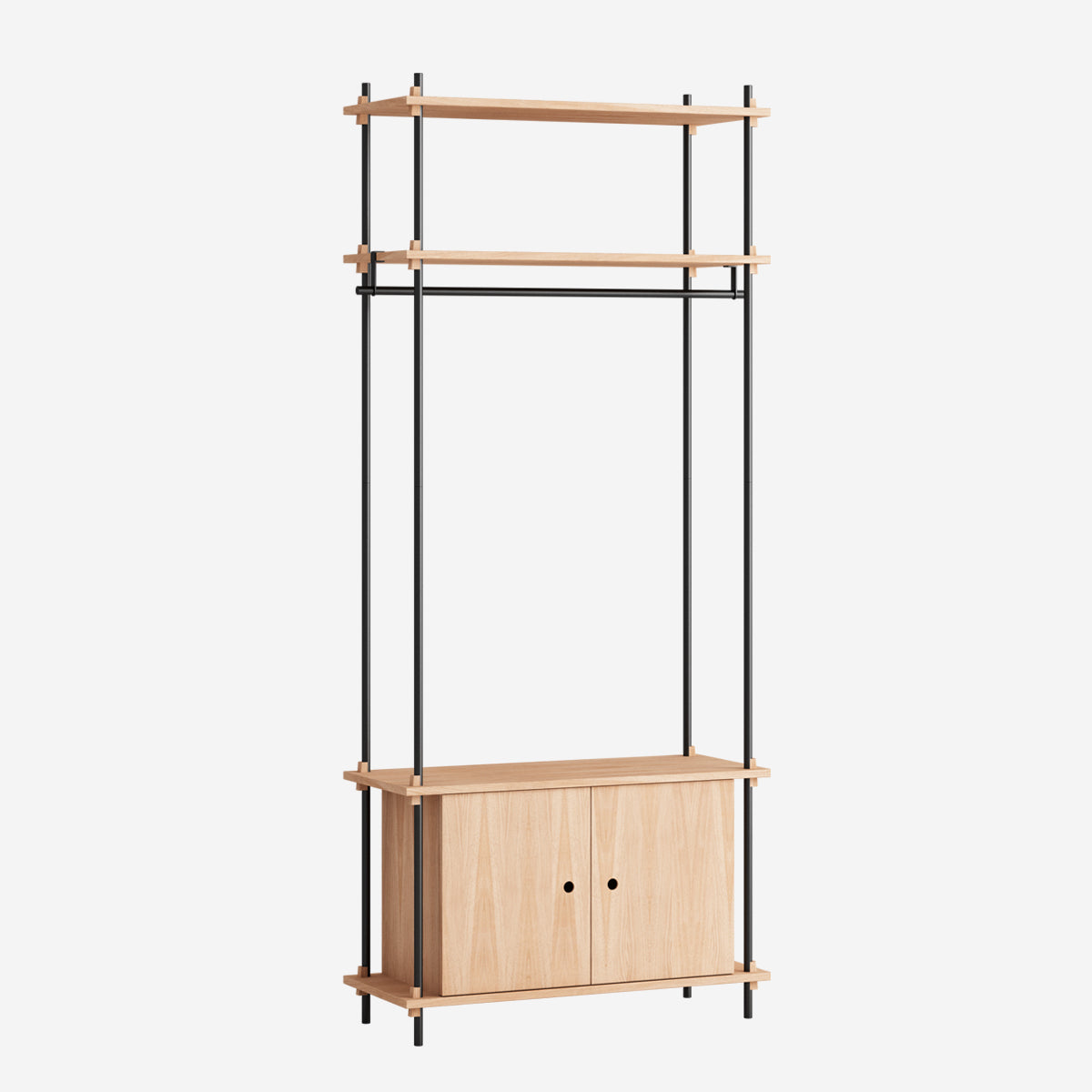 Die Böden und Schrankmodule sind in Eiche Natur und geräuchert, in Schwarz und in Weiß verfügbar. Die Stangen gibt es neben klassischem Schwarz und Weiß auch in Deep Blue, Pine Green, Warm Grey. Durch die Kombination verschiedener Längen, die fast unsichtbar ineinander geschraubt werden, ist fast jede individuelle Höhe konfigurierbar.