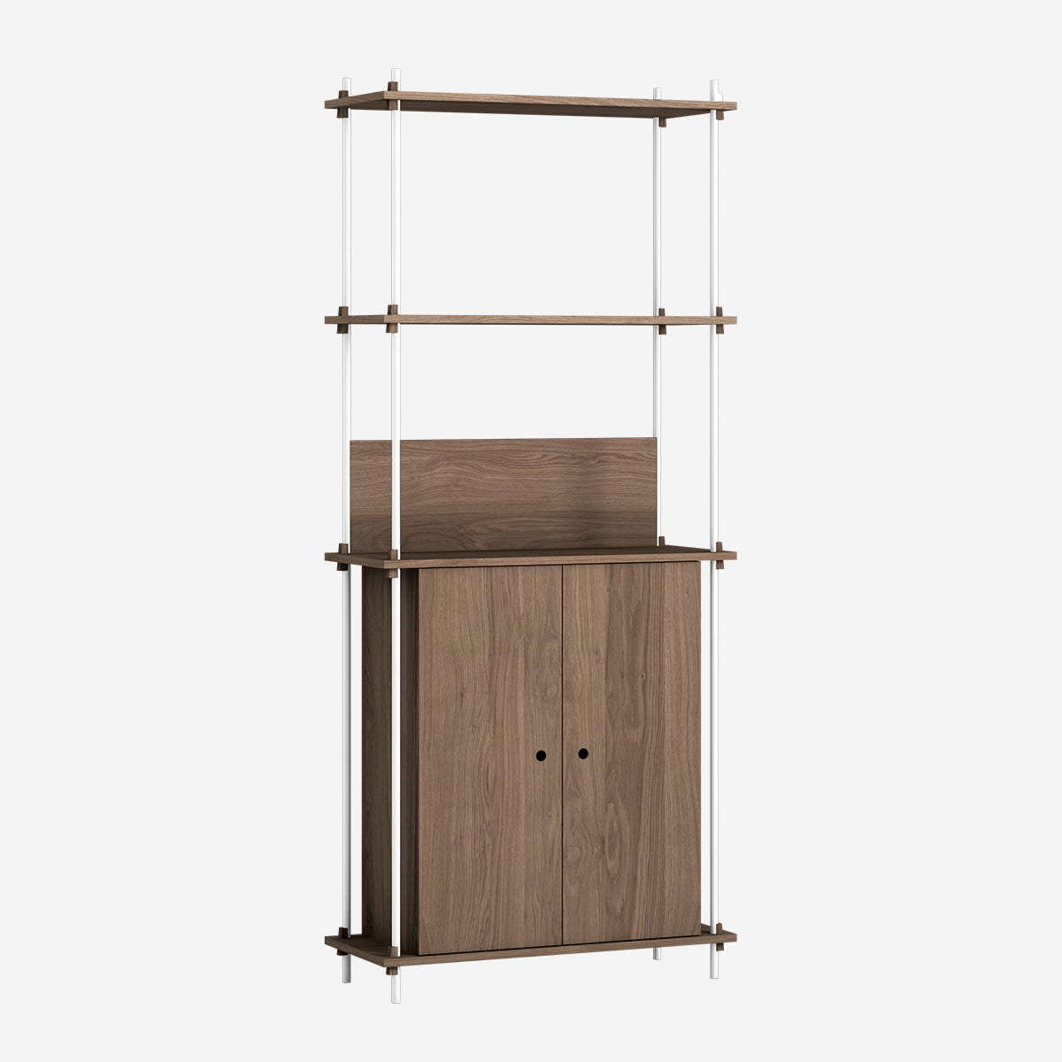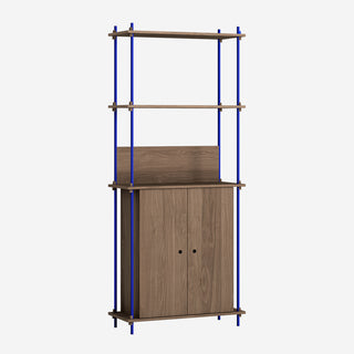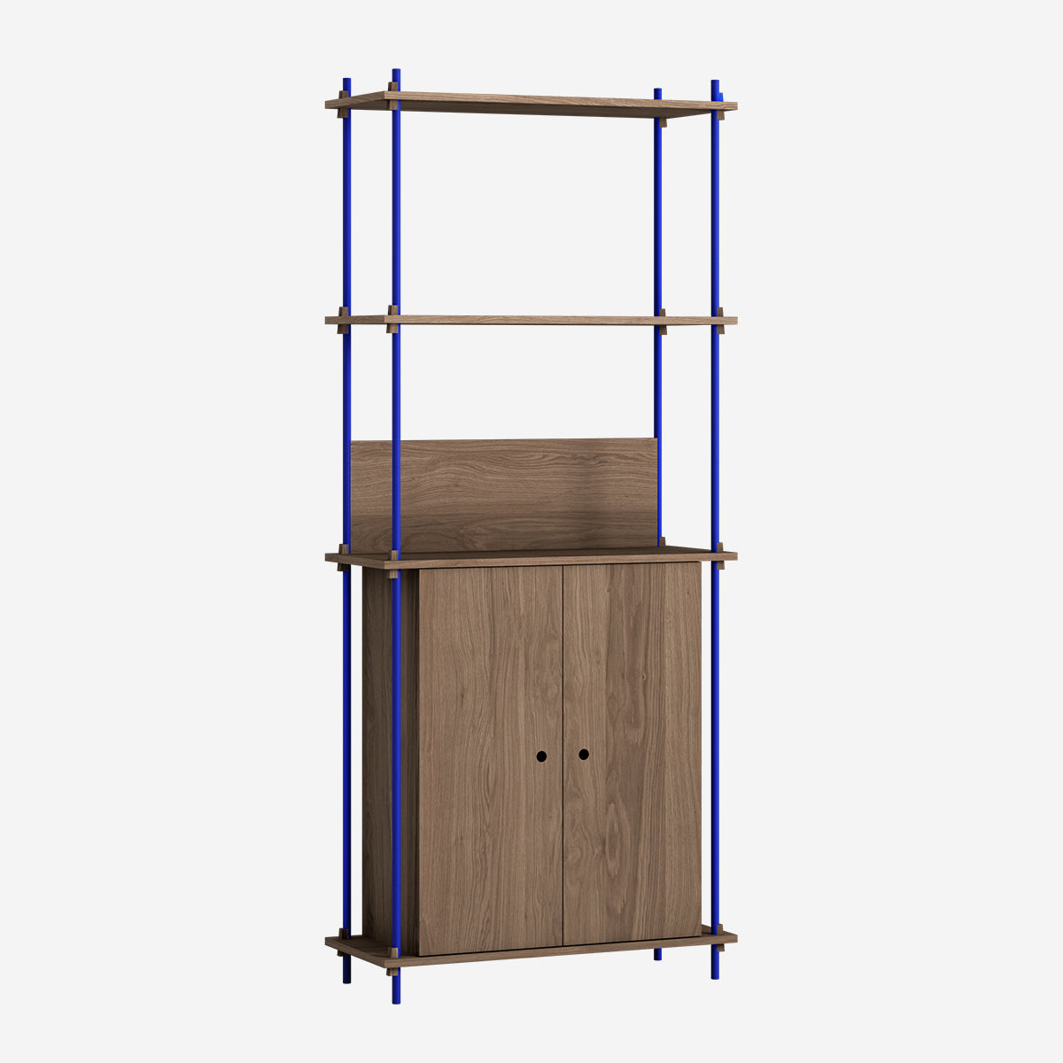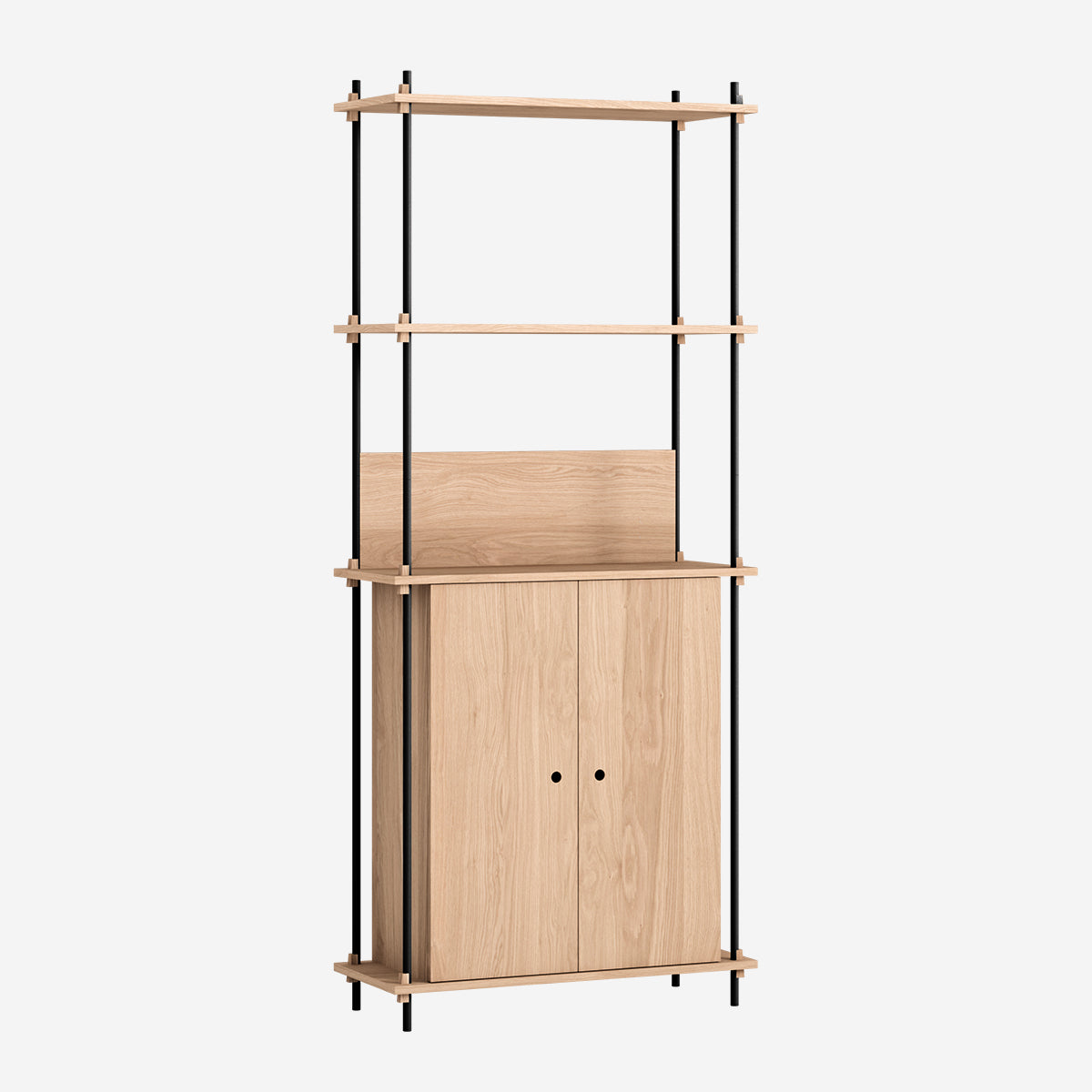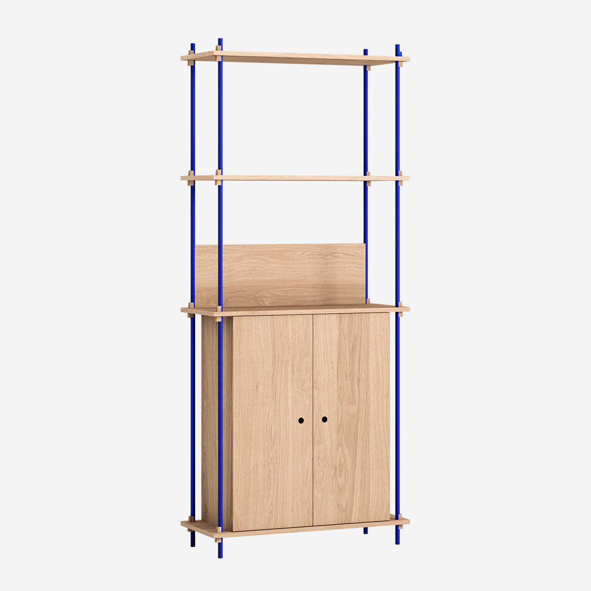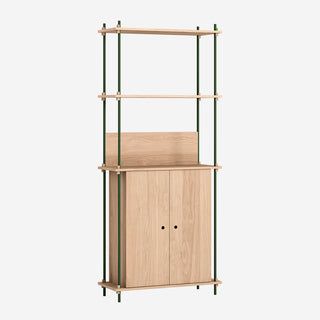Die Böden und Schrankmodule sind in Eiche Natur und geräuchert, in Schwarz und in Weiß verfügbar. Die Stangen gibt es neben klassischem Schwarz und Weiß auch in Deep Blue, Pine Green, Warm Grey. Durch die Kombination verschiedener Längen, die fast unsichtbar ineinander geschraubt werden, ist fast jede individuelle Höhe konfigurierbar.