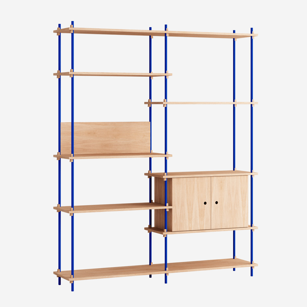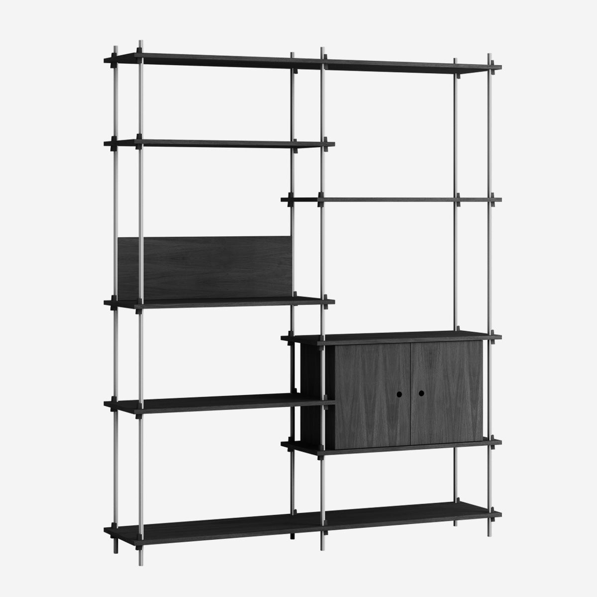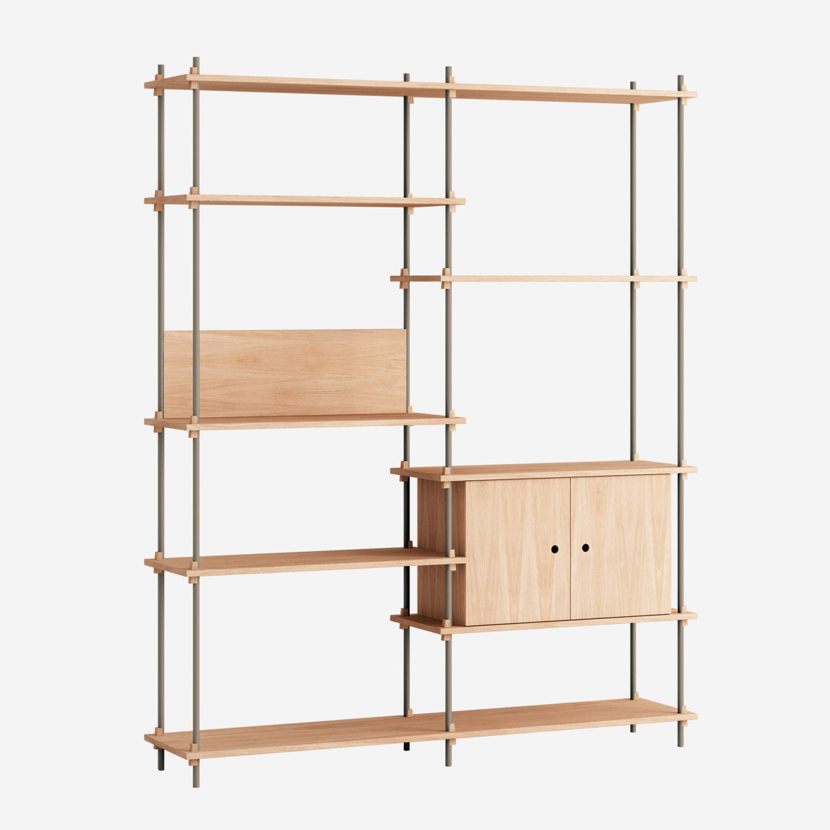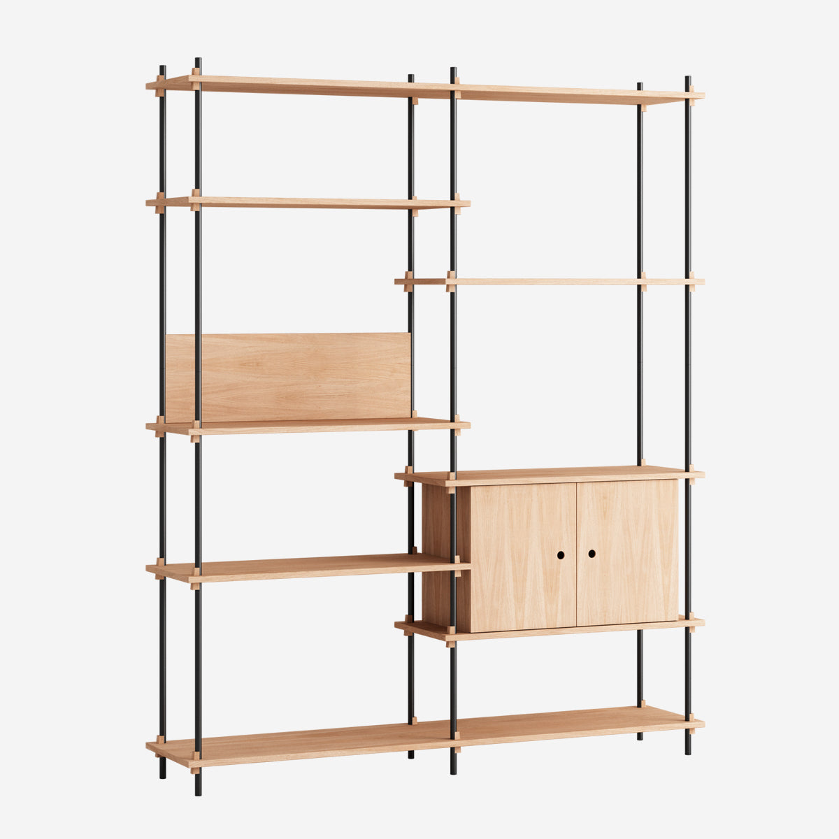 Die Böden und Schrankmodule sind in Eiche Natur und geräuchert, in Schwarz und in Weiß verfügbar. Die Stangen gibt es neben klassischem Schwarz und Weiß auch in Deep Blue, Pine Green, Warm Grey. Durch die Kombination verschiedener Längen, die fast unsichtbar ineinander geschraubt werden, ist fast jede individuelle Höhe konfigurierbar.