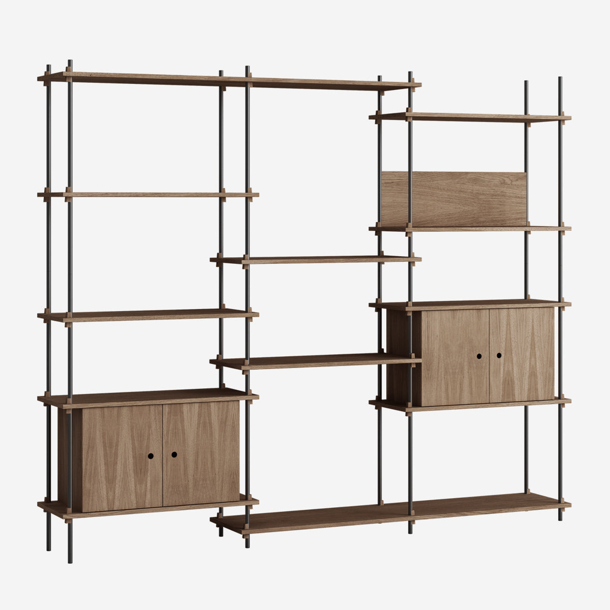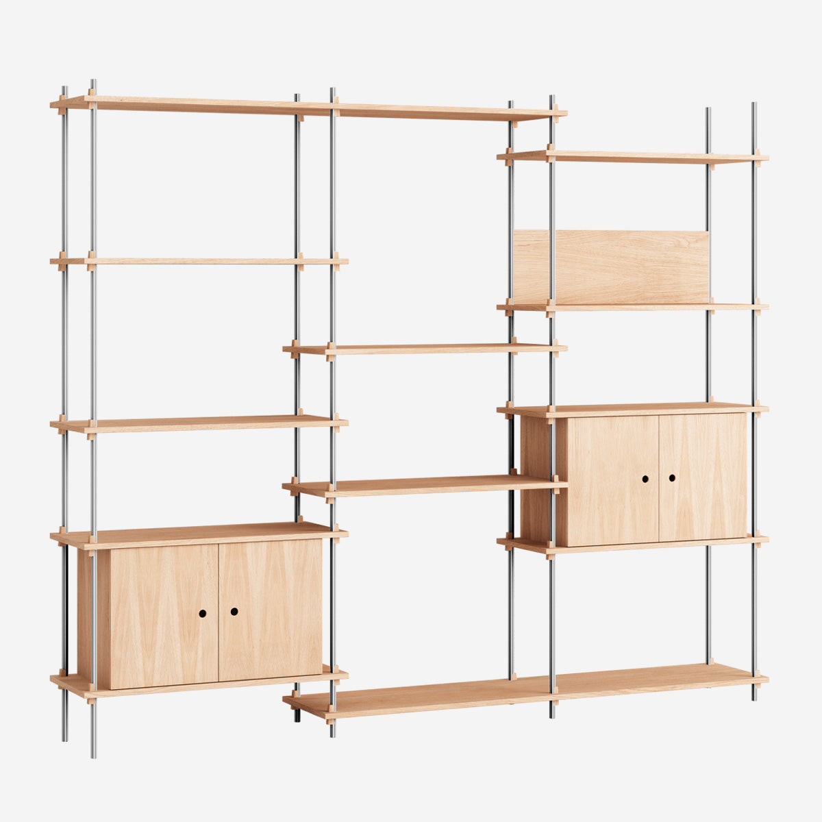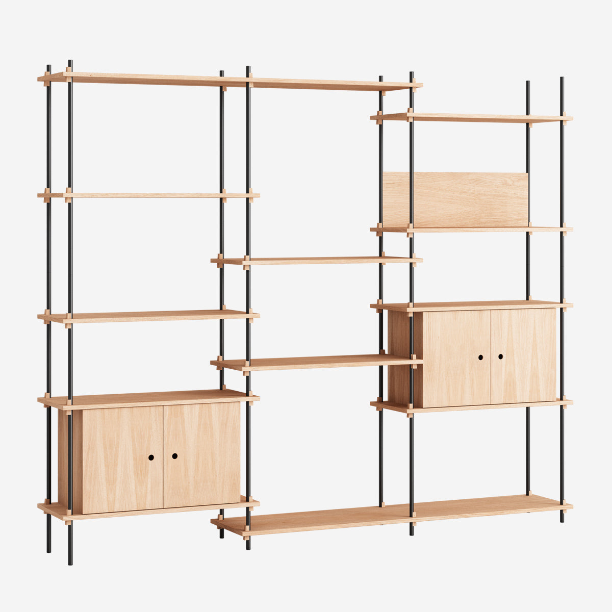 Die Böden und Schrankmodule sind in Eiche Natur und geräuchert, in Schwarz und in Weiß verfügbar. Die Stangen gibt es neben klassischem Schwarz und Weiß auch in Deep Blue, Pine Green, Warm Grey. Durch die Kombination verschiedener Längen, die fast unsichtbar ineinander geschraubt werden, ist fast jede individuelle Höhe konfigurierbar.