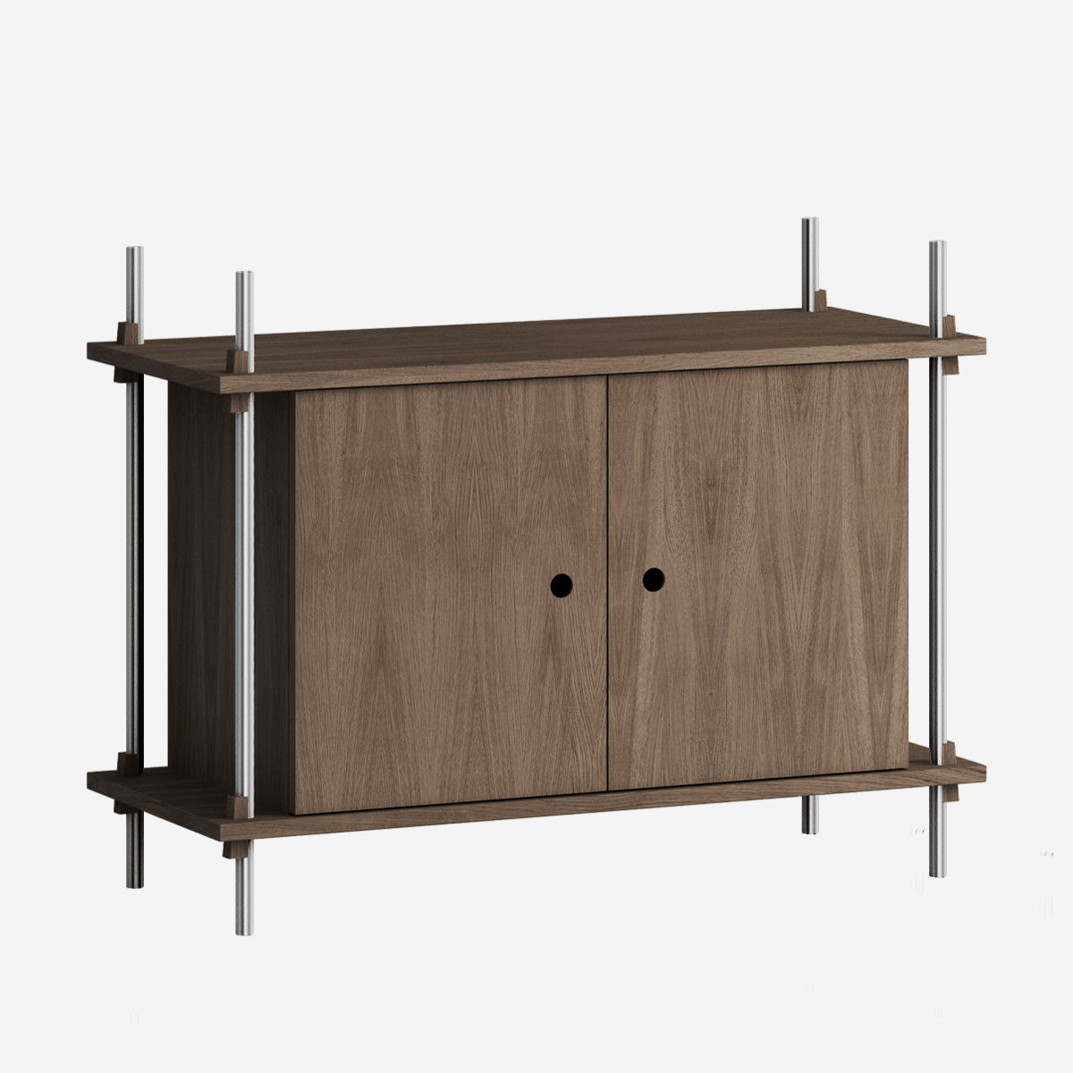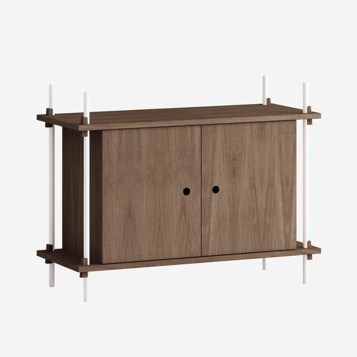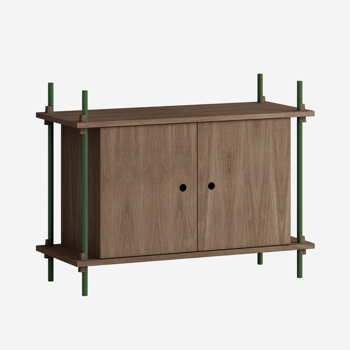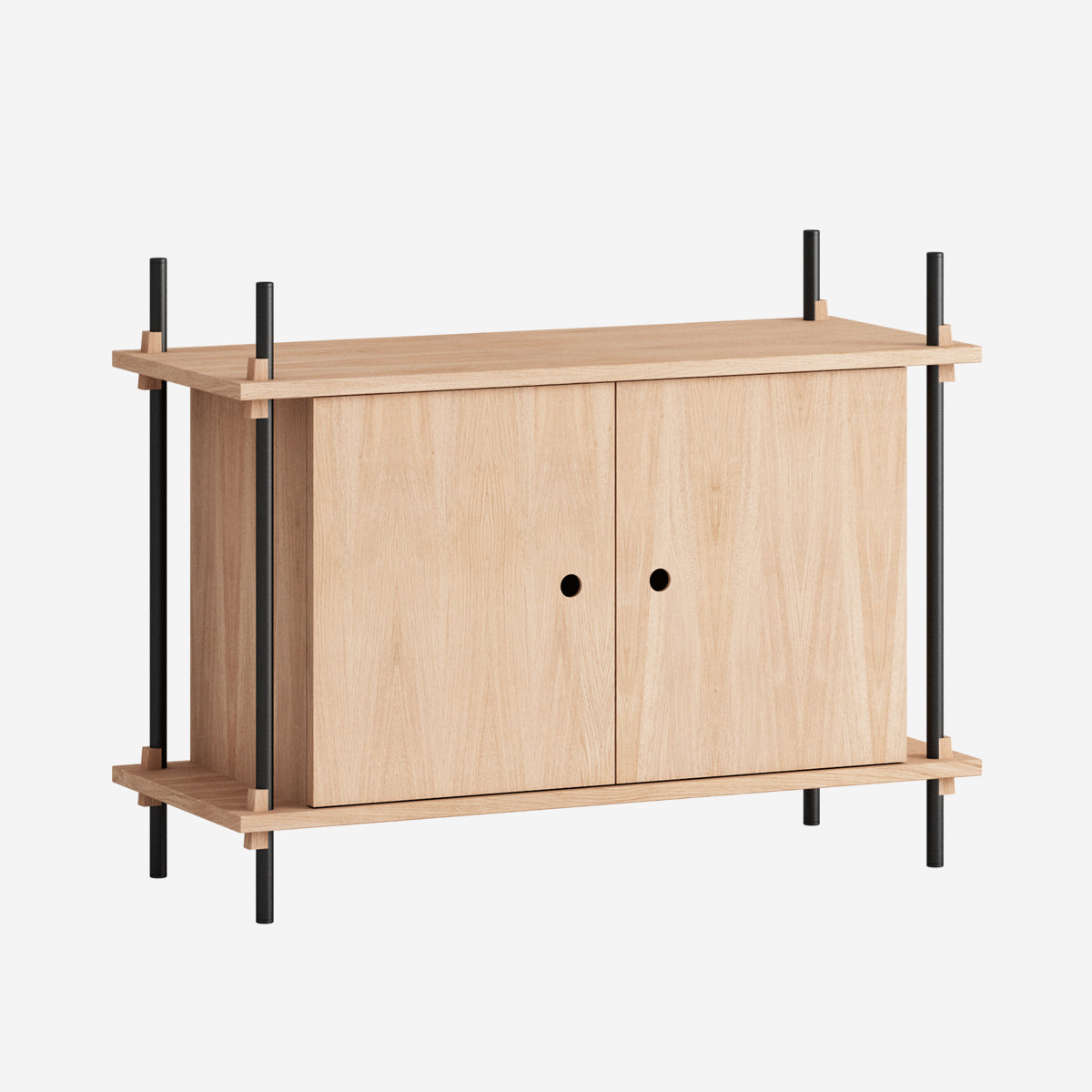 Die Böden und Schrankmodule sind in Eiche Natur und geräuchert, in Schwarz und in Weiß verfügbar. Die Stangen gibt es neben klassischem Schwarz und Weiß auch in Deep Blue, Pine Green, Warm Grey. Durch die Kombination verschiedener Längen, die fast unsichtbar ineinander geschraubt werden, ist fast jede individuelle Höhe konfigurierbar.