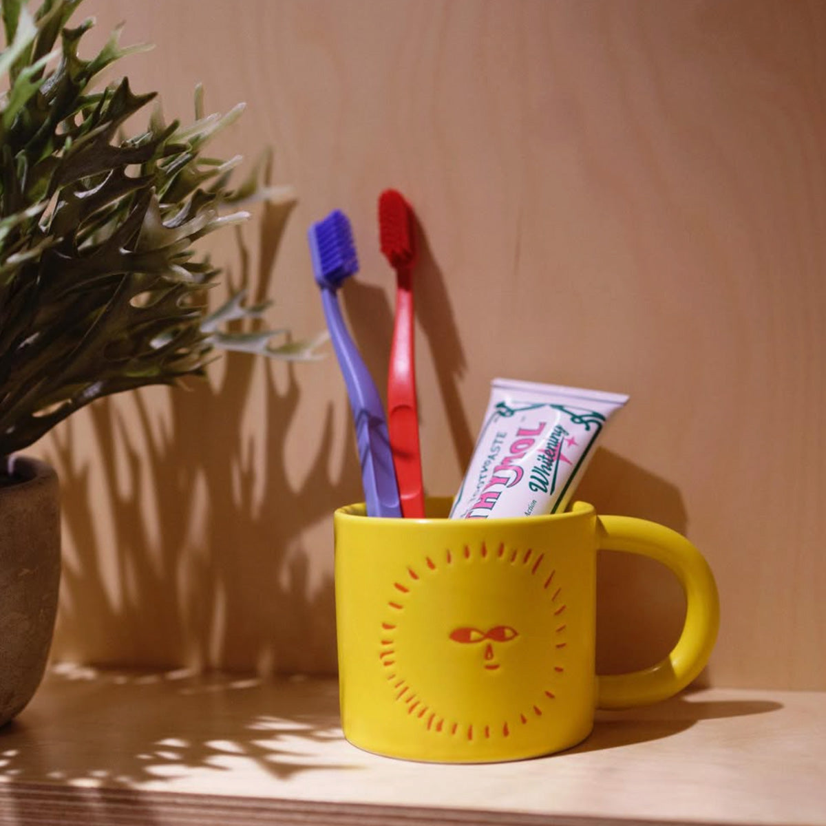 Früh am Morgen, wenn der Kaffee noch wichtiger ist als Worte, wartet diese gelbe Tasse schon voller Tatendrang. Das satte Gelb zieht dich aus der Müdigkeit, die beiden eingedrückten Sonnengesichter schauen so unerschütterlich fröhlich, dass man kurz grinsen muss. Die Tasse liegt angenehm in der Hand, warm und stabil. Ein paar Schlucke später fühlt sich der Tag weniger sperrig an.
