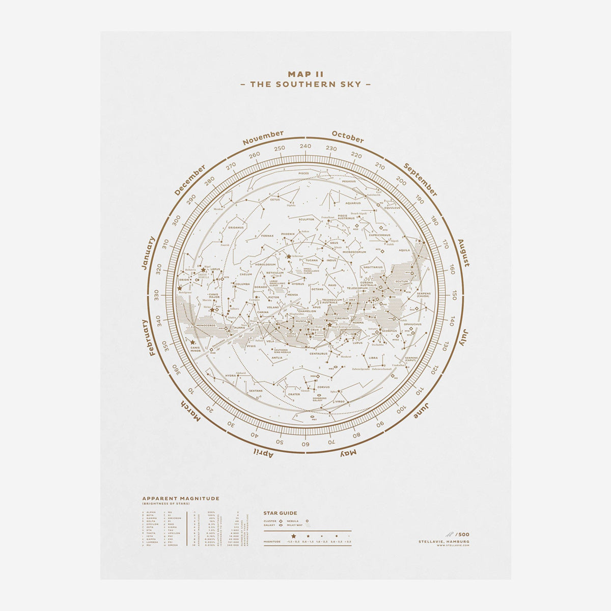 Map 1 – the Northern Sky zeigt die Sternbilder, wie sie von der nördlichen Hemisphäre aus zu sehen sind. Map 2 – the Southern Sky zeigt dementsprechend die südliche Hemisphere.
