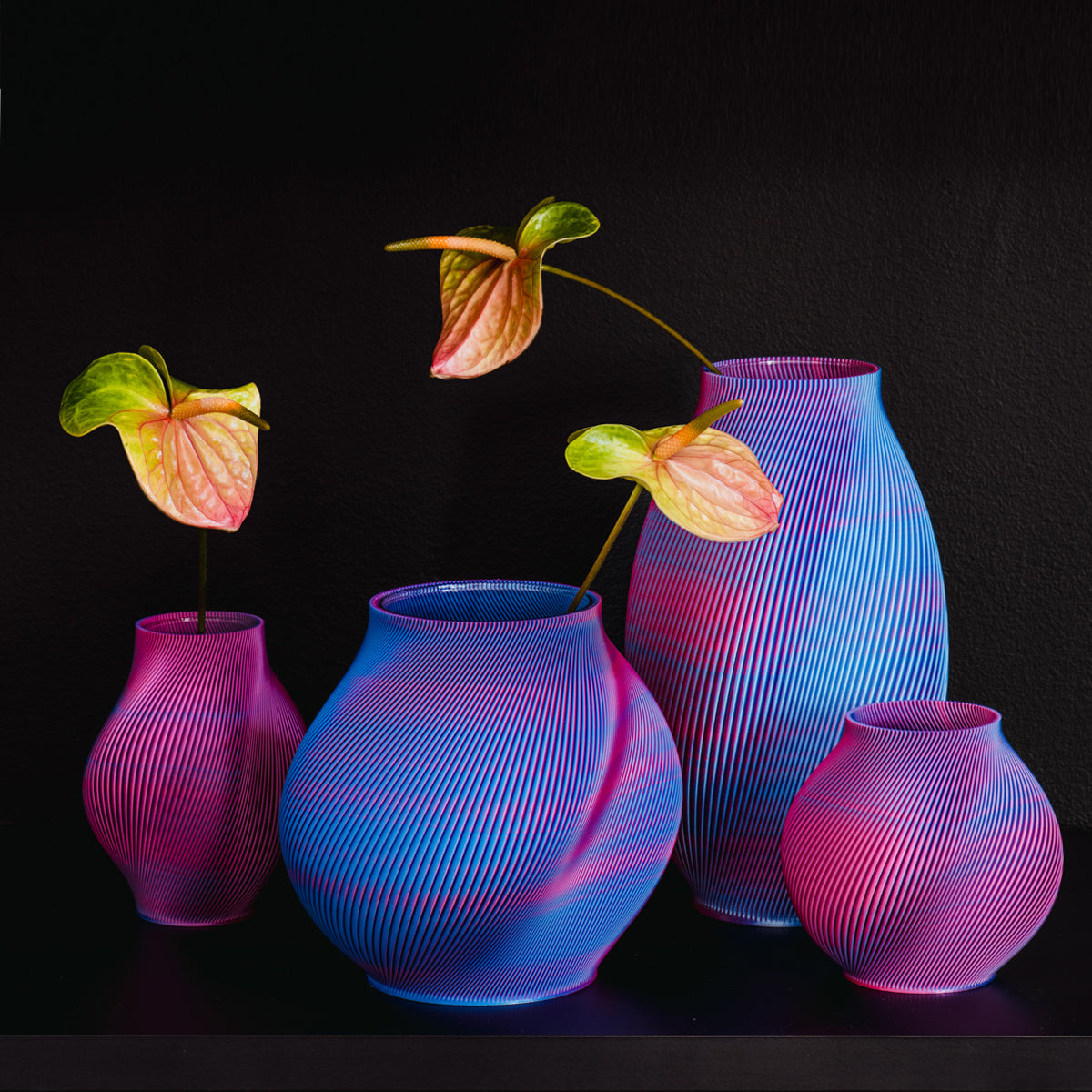 Jede Vase ist präzise gefertigt, voller feiner Details und spielt mit Rhythmus, Licht und Schatten. Ein Objekt, das aus jedem Blickwinkel neu überrascht – und so mehr ist als nur eine Vase: ein Stück bewegte Architektur im Kleinformat.